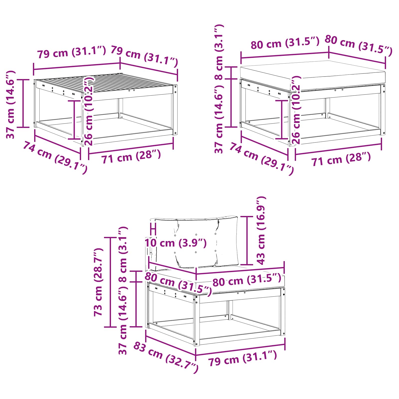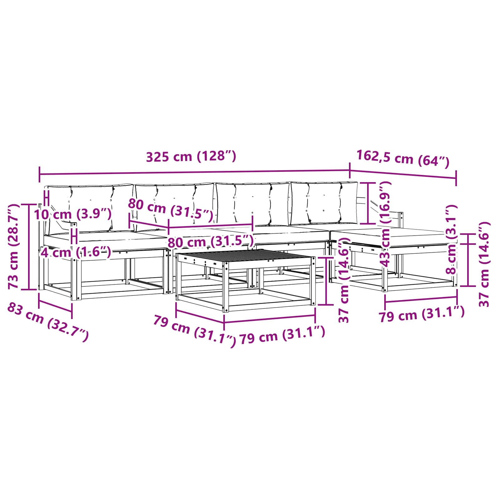 • 4 x střední pohovka: 79 x 83 x 73 cm (D x Š x V)