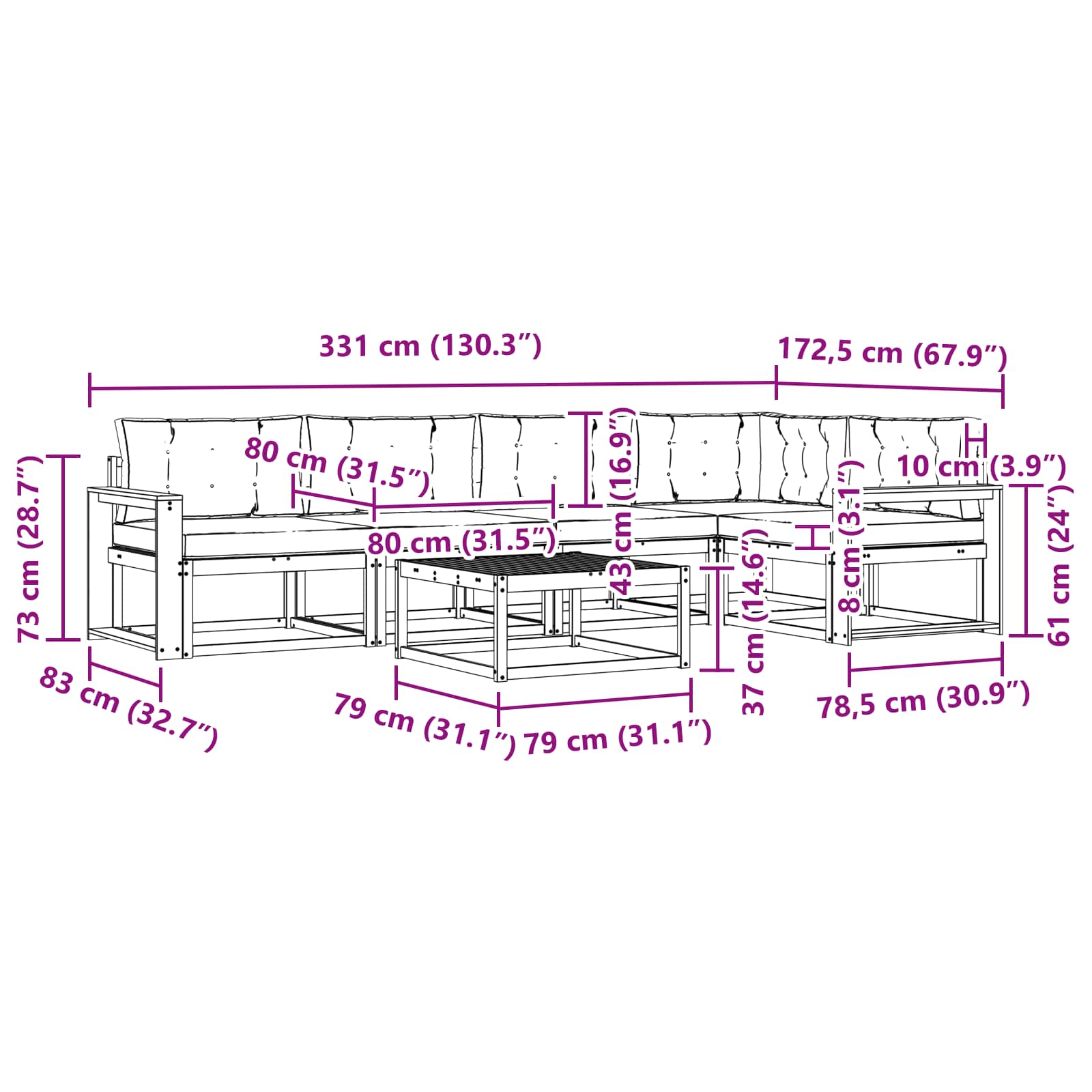 • 4 x Střední pohovka: 79 x 83 x 73 cm (D x Š x V)