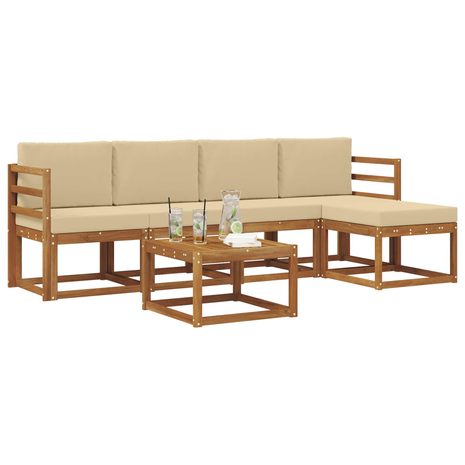 Tento venkovní nábytek přináší perfektní mix moderního stylu a praktického designu. Vytvořený pro venkovní prostory, jeho vzhled je jednoduchý a elegantní, doplněný teplou barvou masivního akáciového dřeva. Ať už máte terasu nebo dvorek, tento set přetvoří vaši zahradu na pohodové místo k odpočinku se svým lákavým designem a funkčním uspořádáním. Ideální pro rodiny a hostitele, jeho smart design spojuje pohodlí a hezký vzhled, láká hosty, aby si pobyt užili co nejdéle.