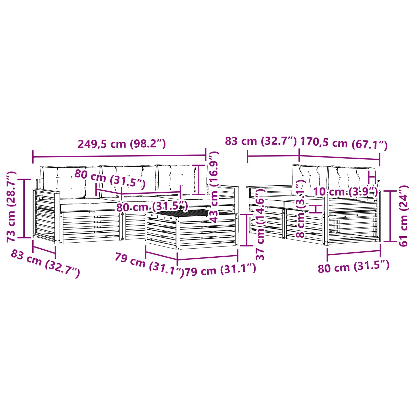 • 5 x Středová pohovka: 79 x 83 x 73 cm (D x Š x V)