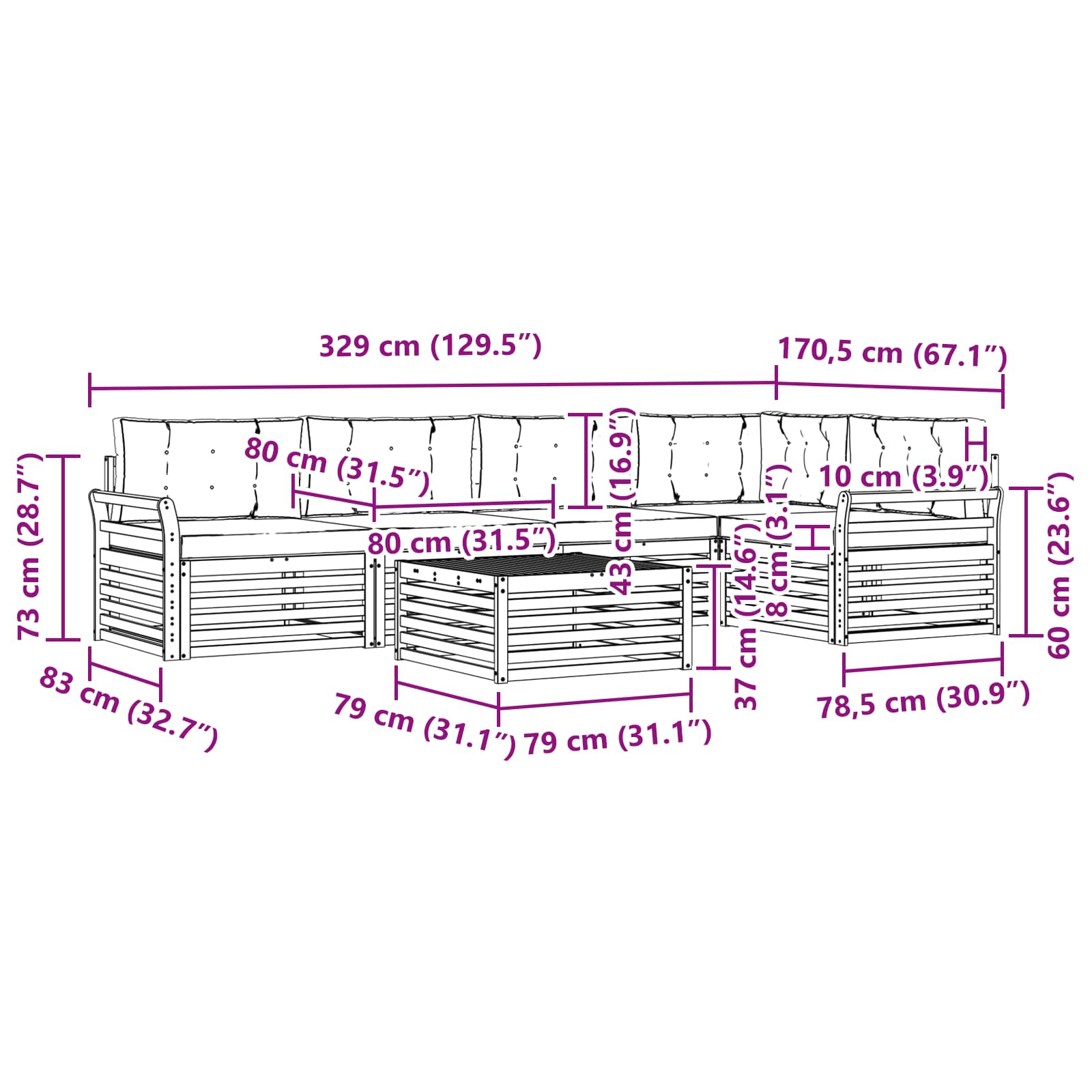 • 4 x Střední pohovka: 79 x 83 x 73 cm (D x Š x V)