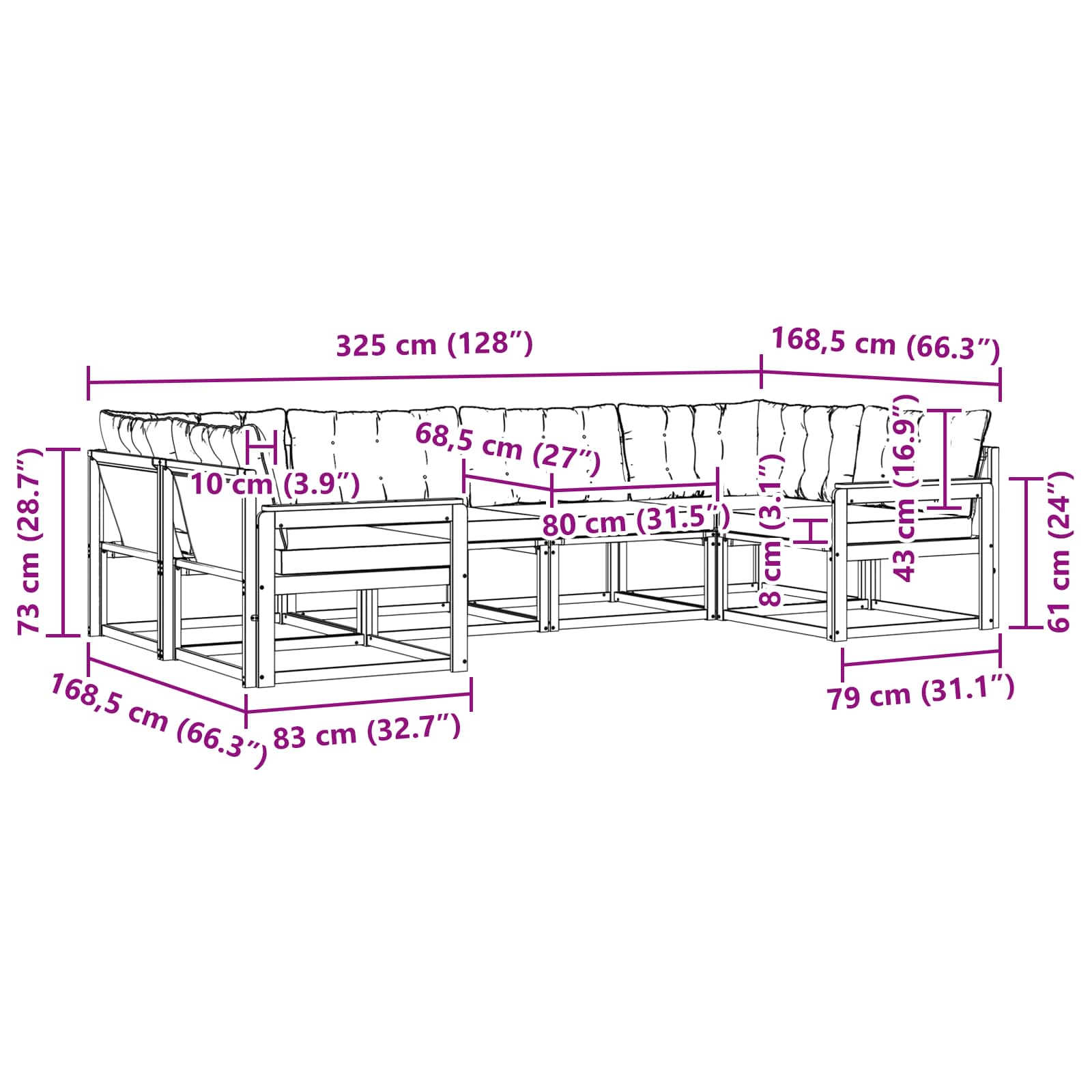 • 8 x zadní polštář: 80 x 43 x 10 cm (D x Š x V)