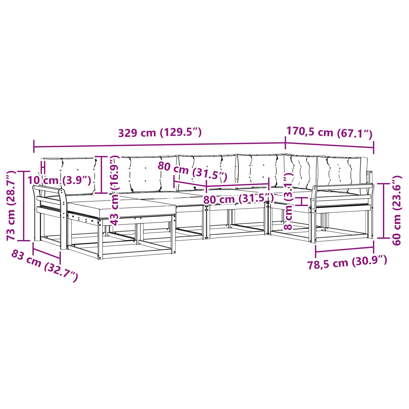 • 4 x Střední pohovka: 79 x 83 x 73 cm (D x Š x V)