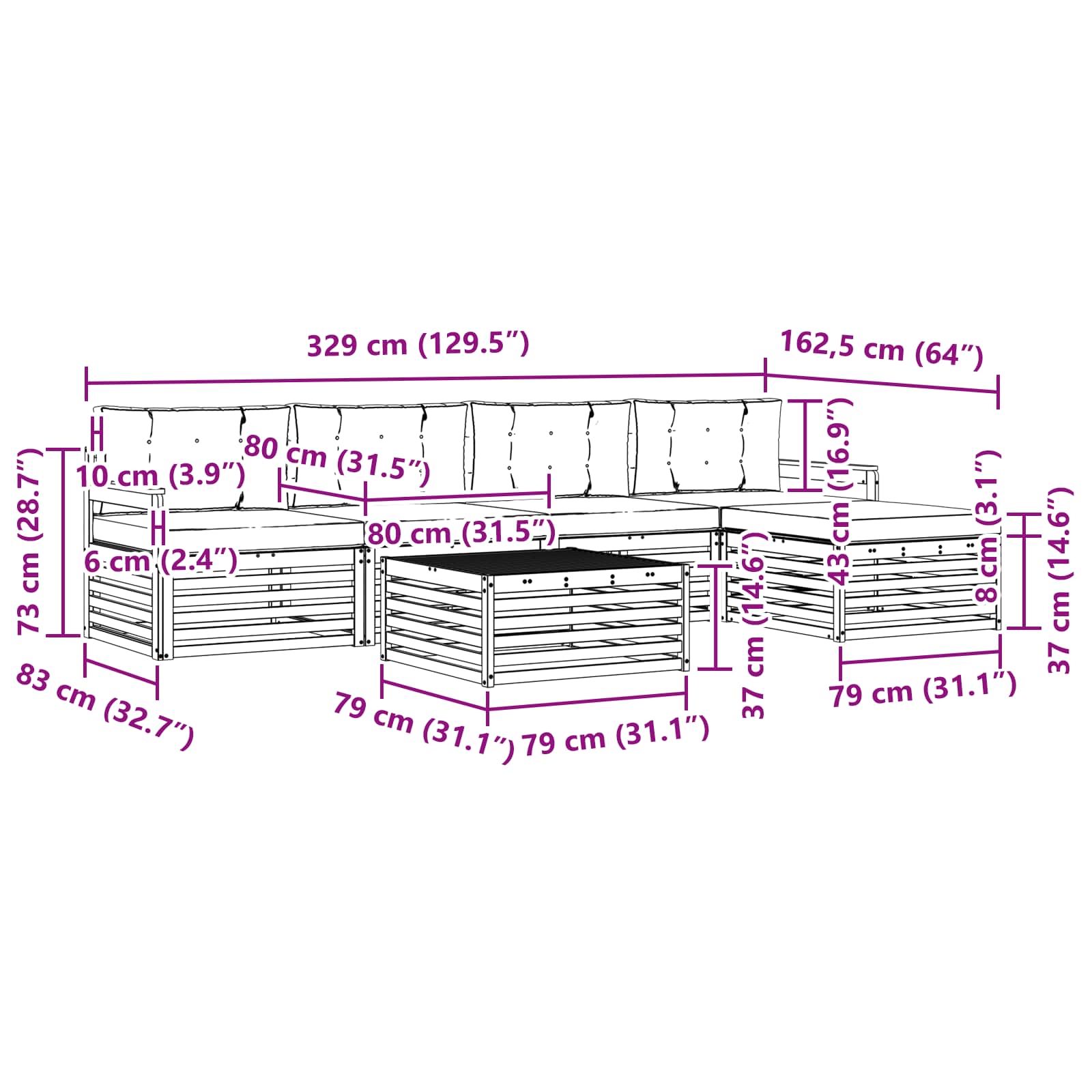 • 4 x Středový pohovka: 79 x 83 x 73 cm (D x Š x V)
