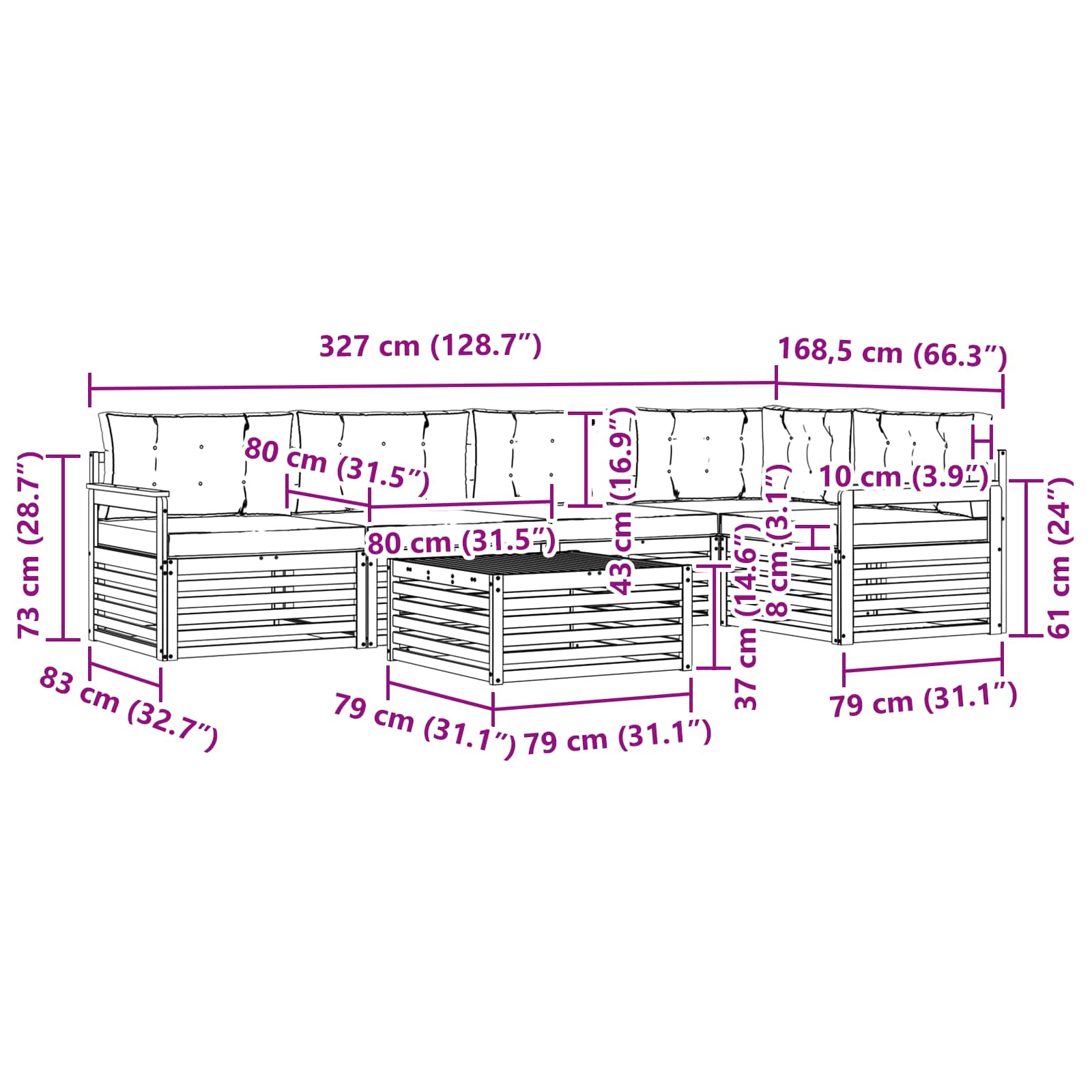 • 4 x Střední pohovka: 79 x 83 x 73 cm (D x Š x V)