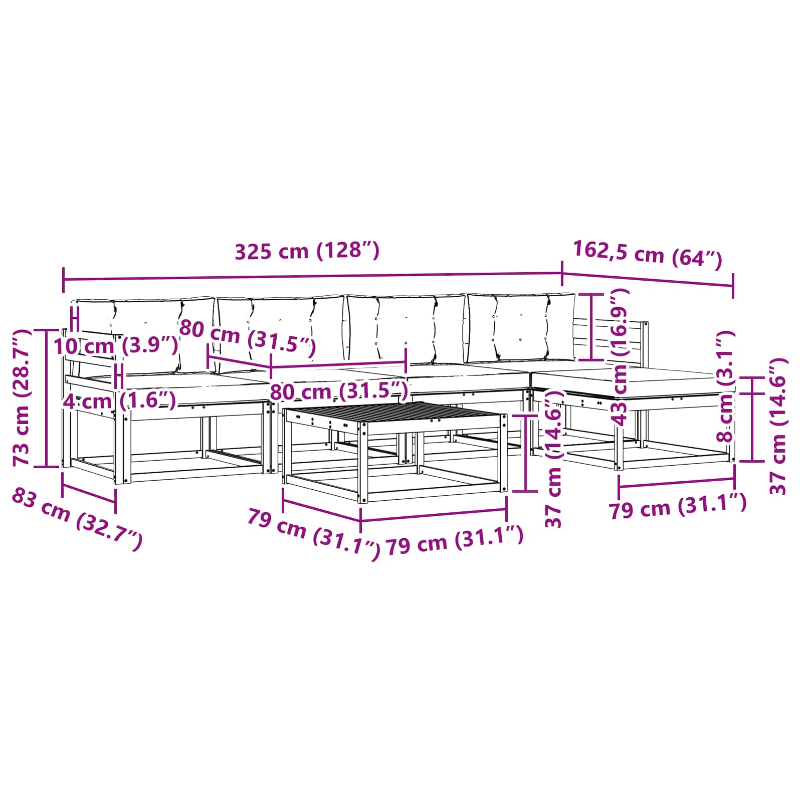• 4 x střední pohovka: 79 x 83 x 73 cm (D x Š x V)