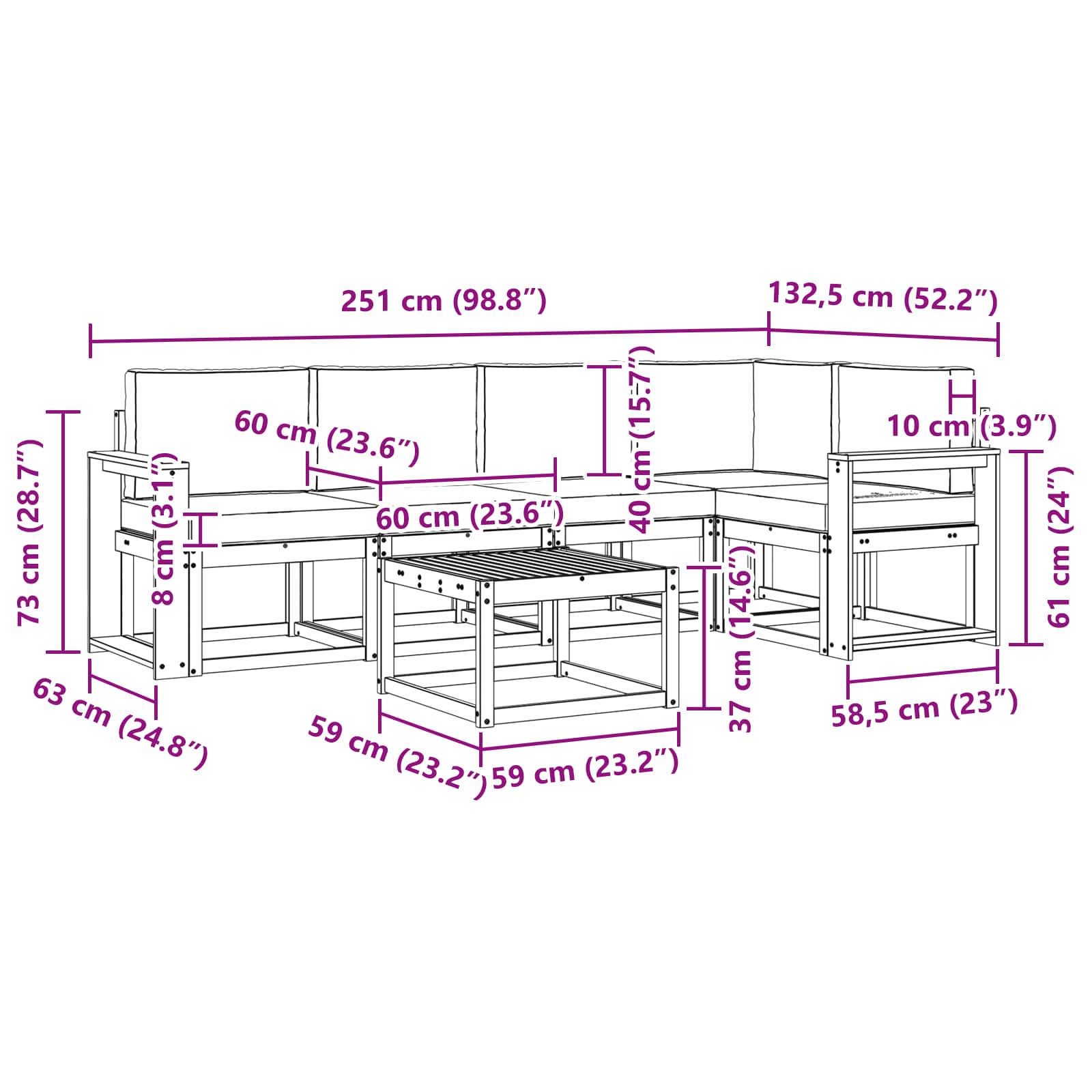 • 5 x Polštář na sezení: 60 x 60 x 8 cm (D x Š x V)