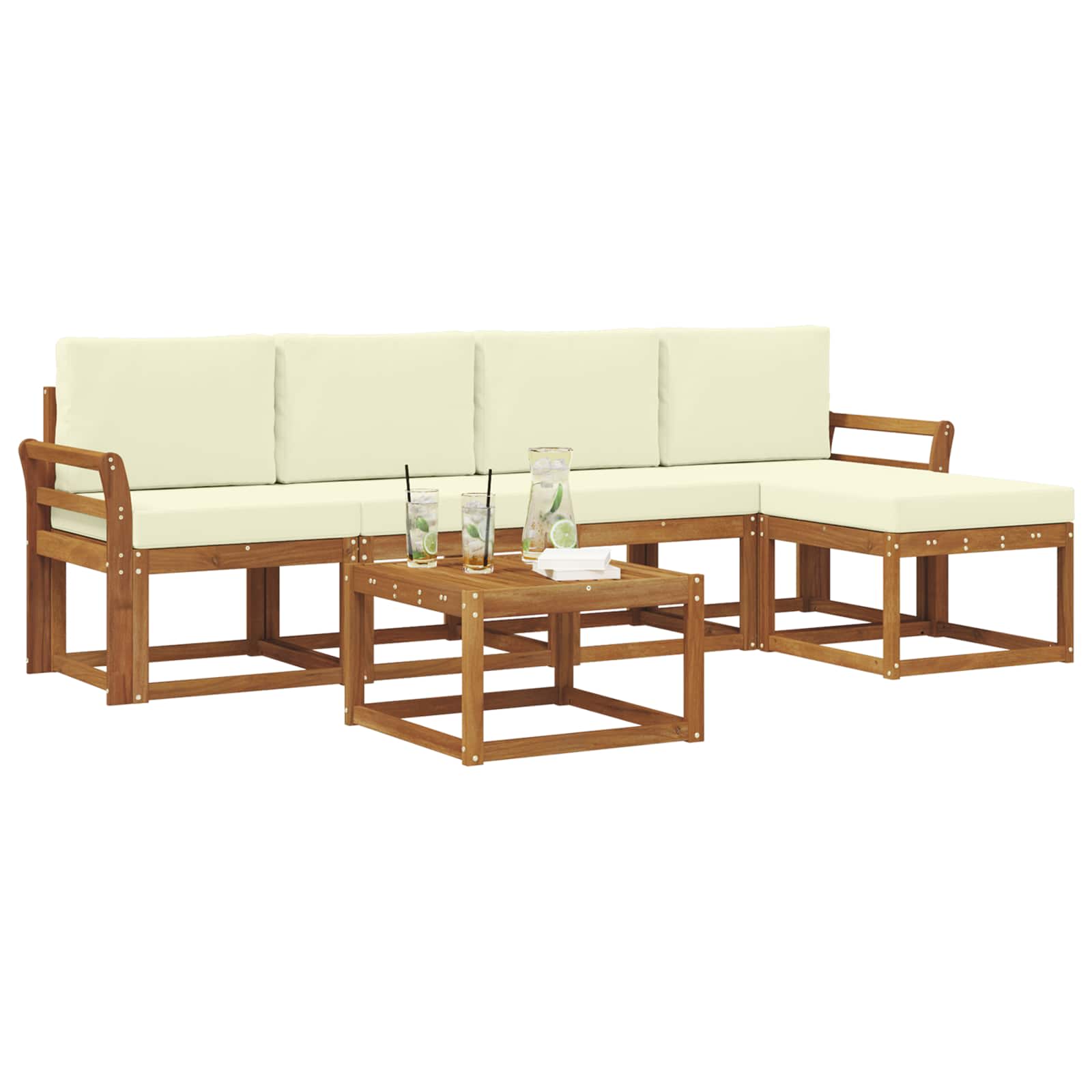 Tento venkovní nábytek přináší perfektní mix moderního stylu a praktického designu. Vytvořený pro venkovní prostory, jeho vzhled je jednoduchý a elegantní, doplněný teplou barvou masivního akáciového dřeva. Ať už máte terasu nebo dvorek, tento set přetvoří vaši zahradu na pohodové místo k odpočinku se svým lákavým designem a funkčním uspořádáním. Ideální pro rodiny a hostitele, jeho smart design spojuje pohodlí a hezký vzhled, láká hosty, aby si pobyt užili co nejdéle.