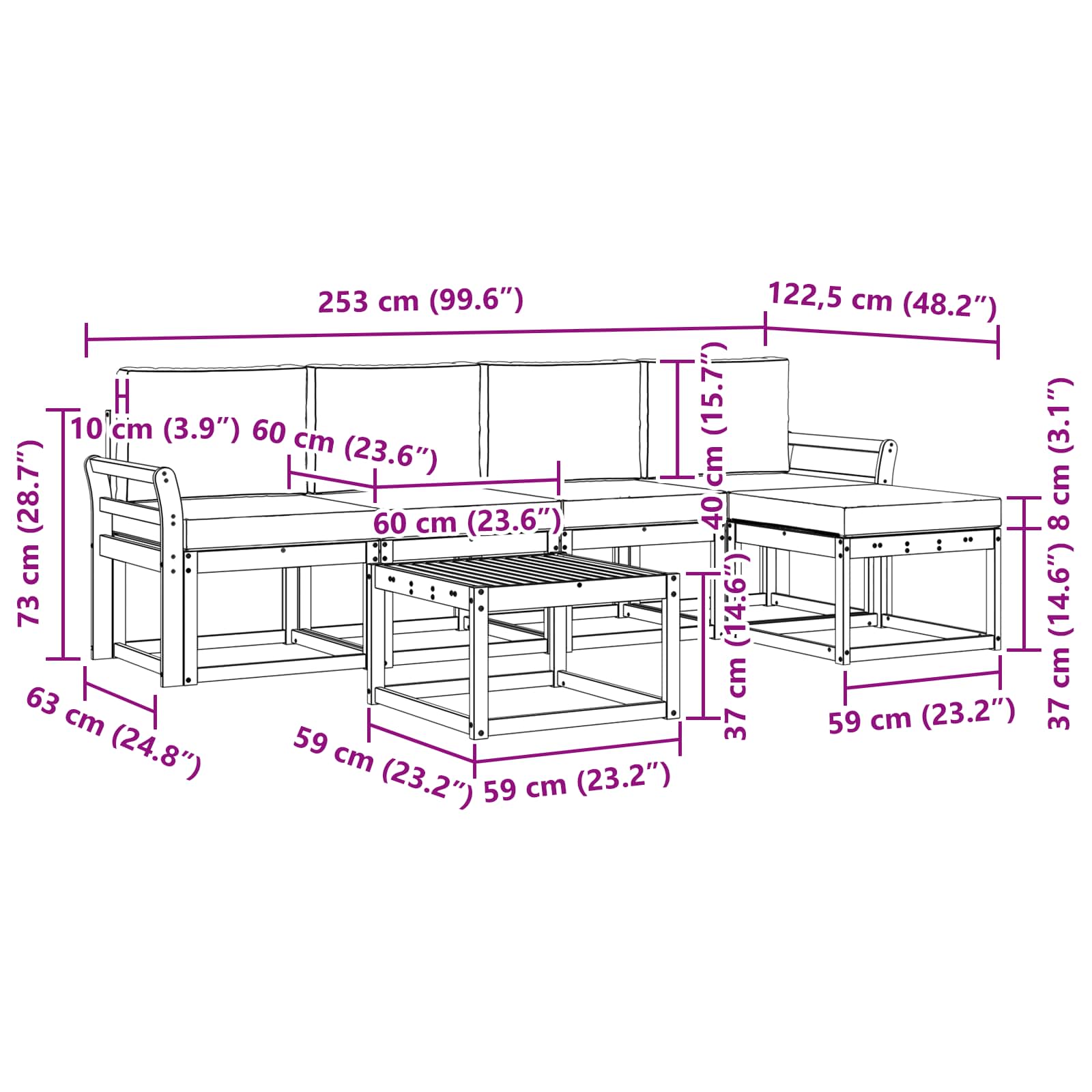 • 4 x Střední pohovka: 59 x 63 x 73 cm (D x Š x V)