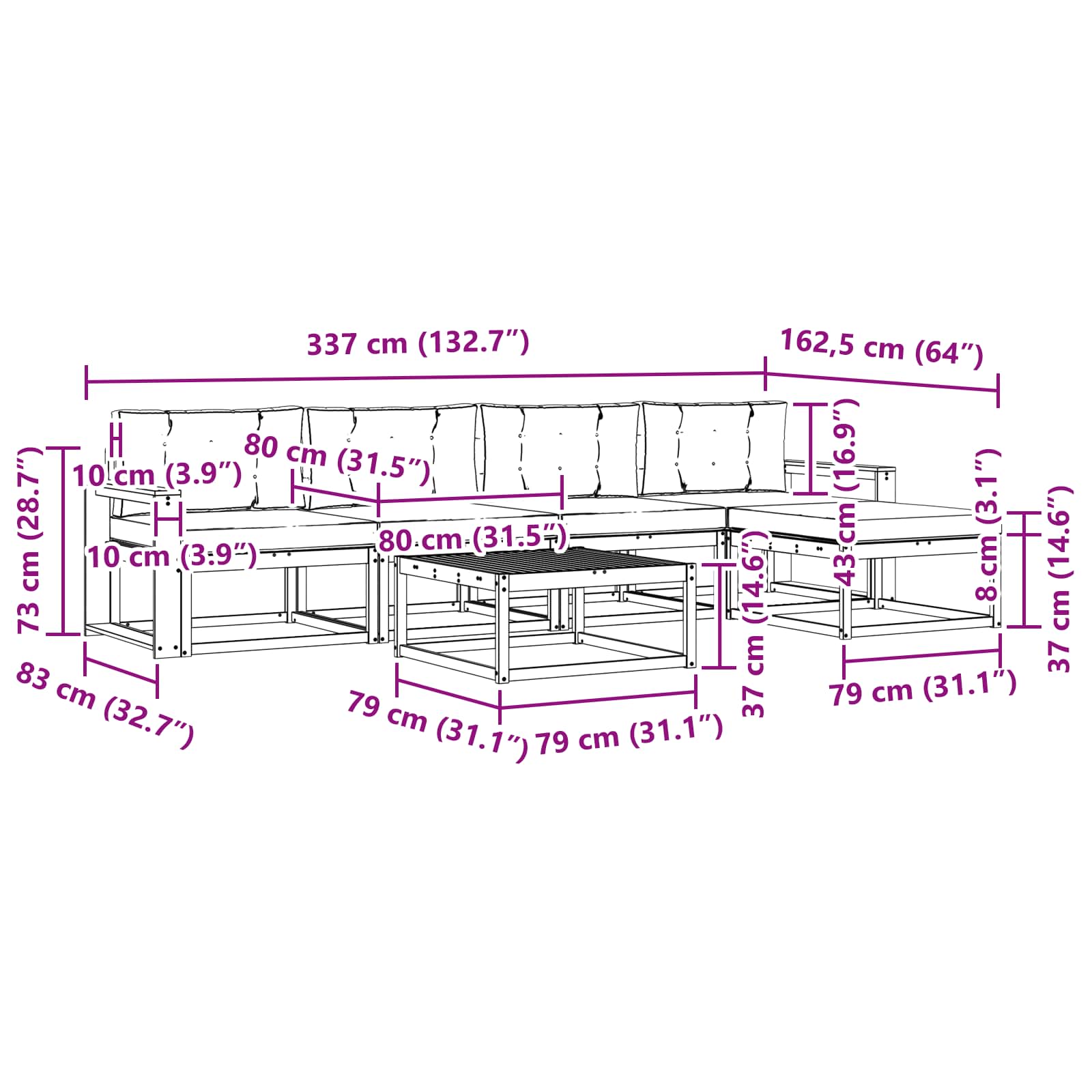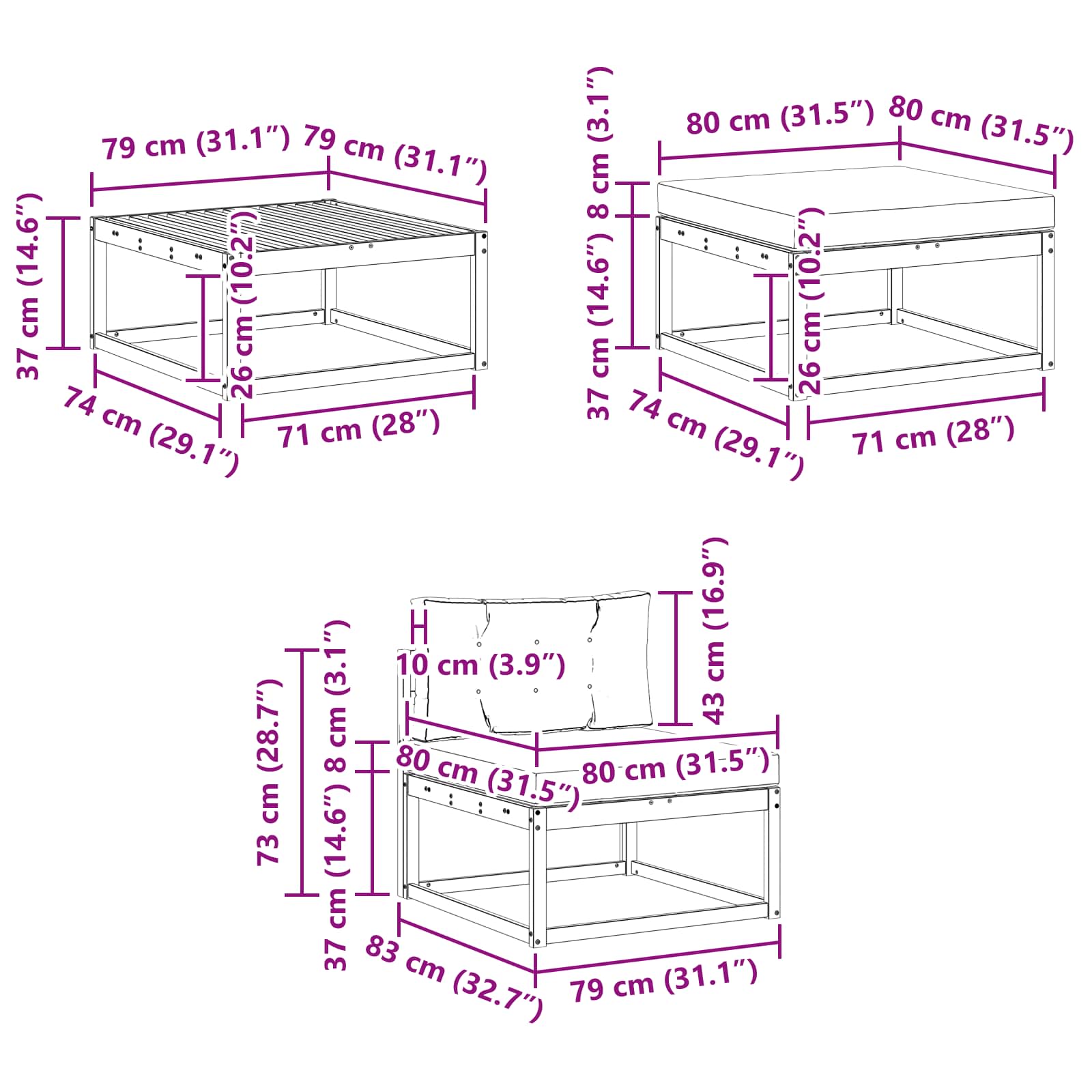 • 4 x střední pohovka: 79 x 83 x 73 cm (D x Š x V)