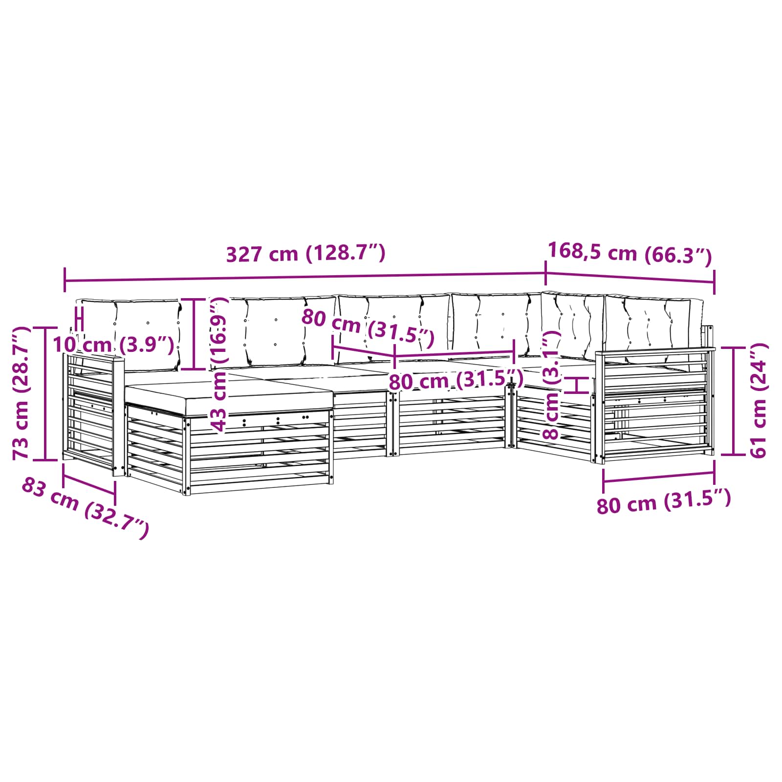 • 6 x Zádový polštář: 80 x 43 x 10 cm (D x Š x V)