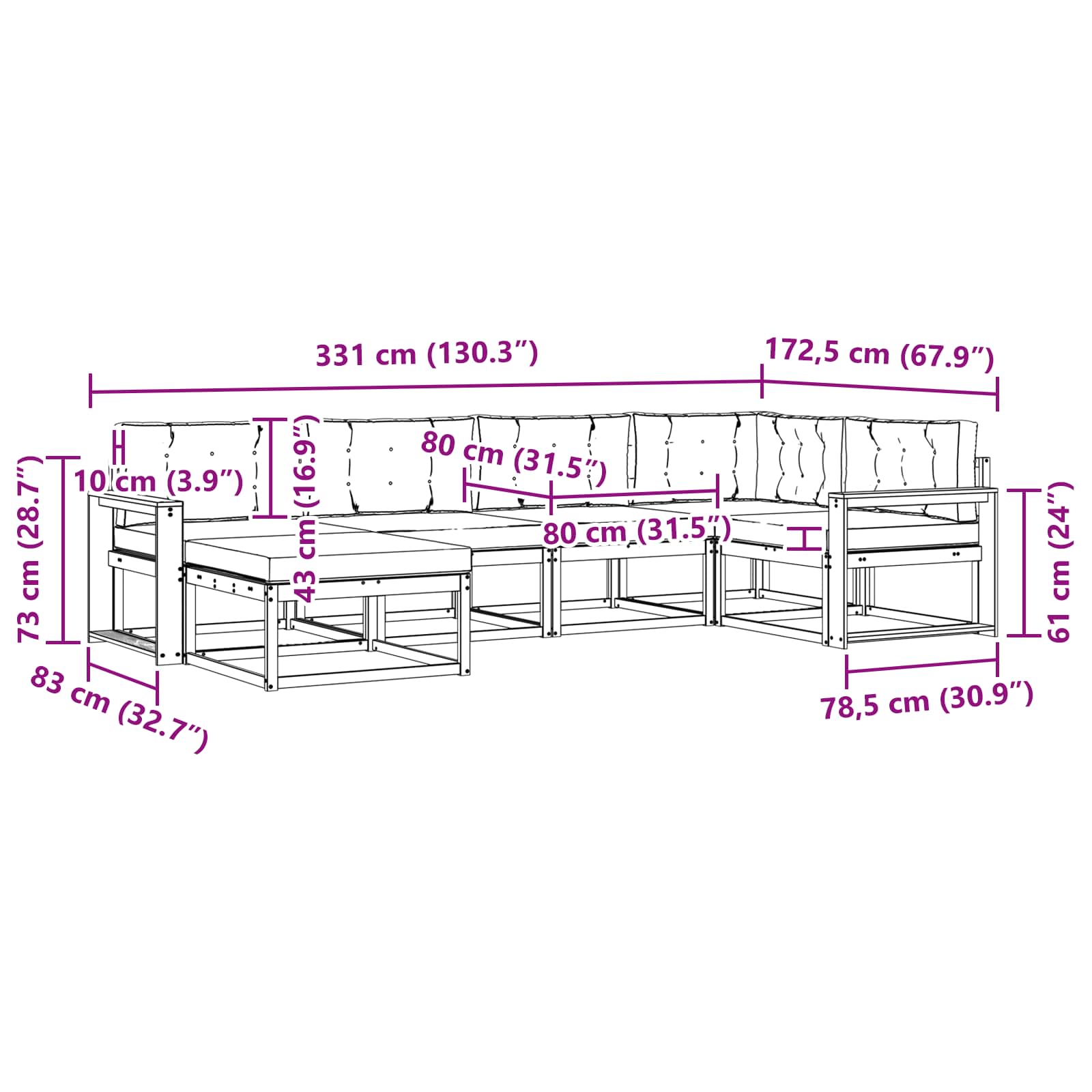 • 6 x Zádový polštář: 80 x 43 x 10 cm (D x Š x V)