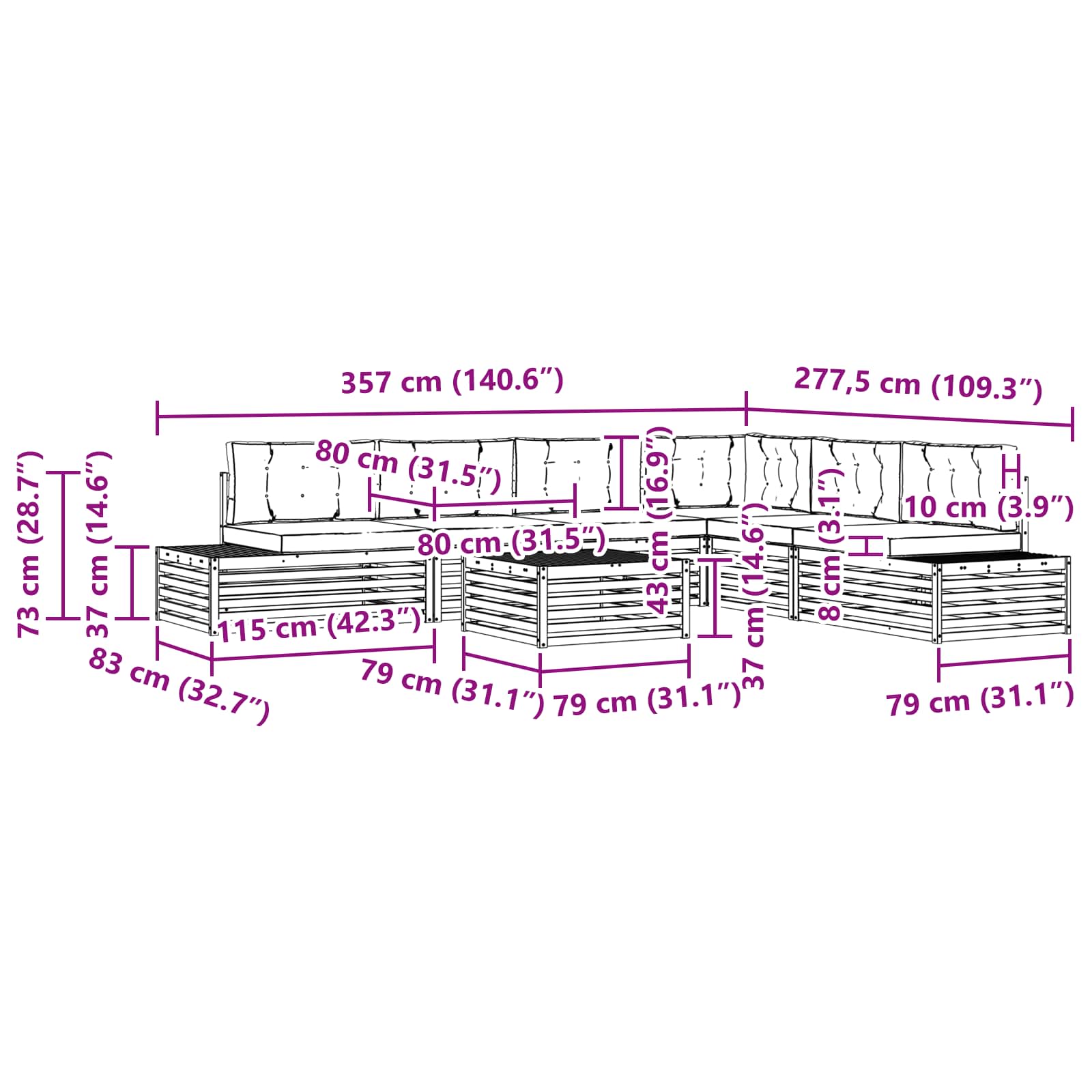 • 3 x Prostřední pohovka: 79 x 83 x 73 cm (D x Š x V)