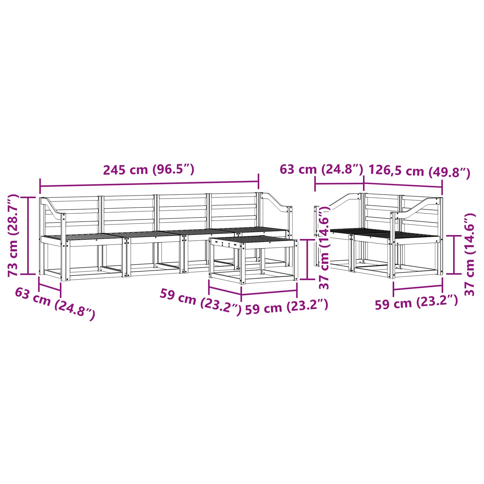 • 6 x Střední pohovka: 59 x 63 x 73 cm (D x Š x V)