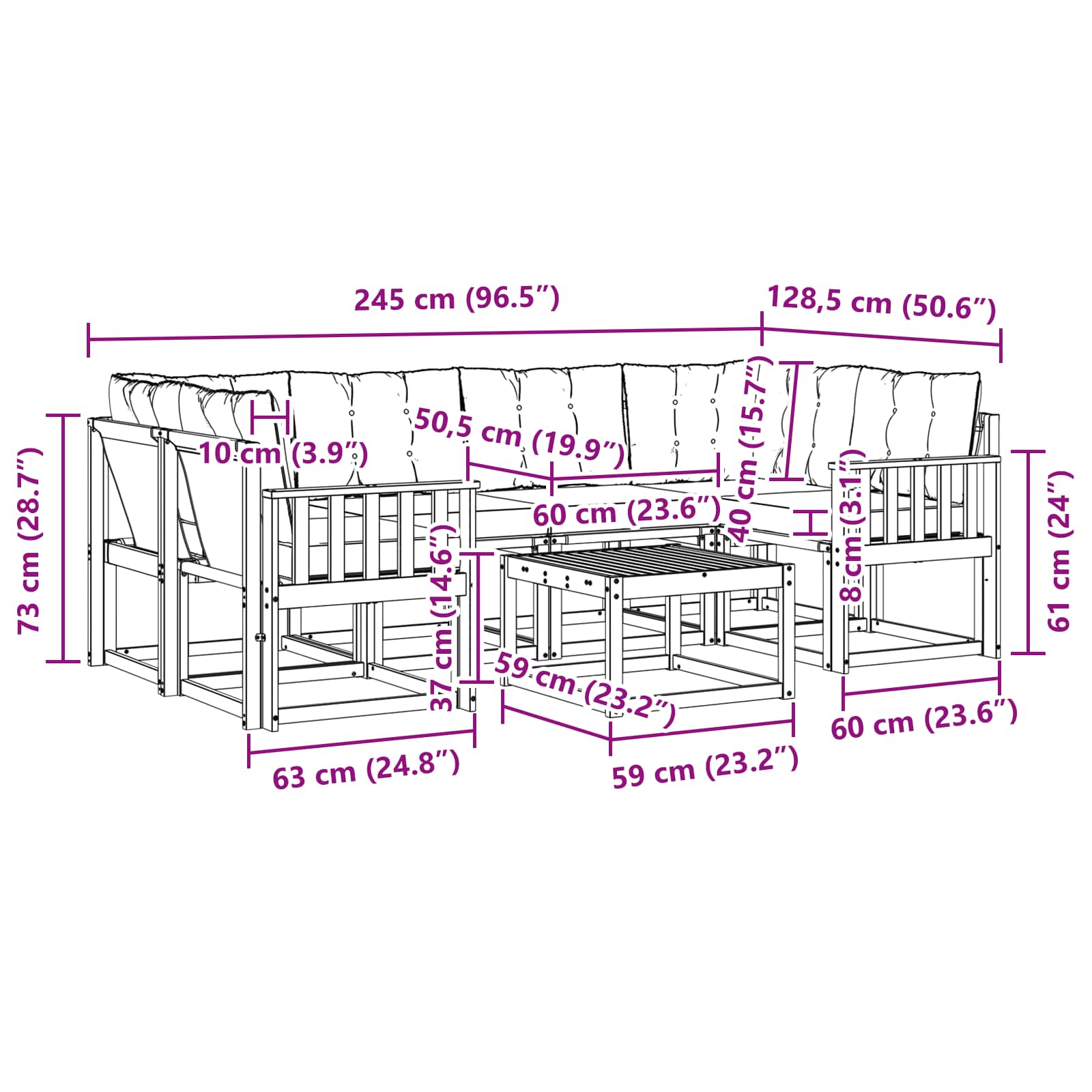 • 4 x Středová sedací souprava: 59 x 63 x 73 cm (D x Š x V)