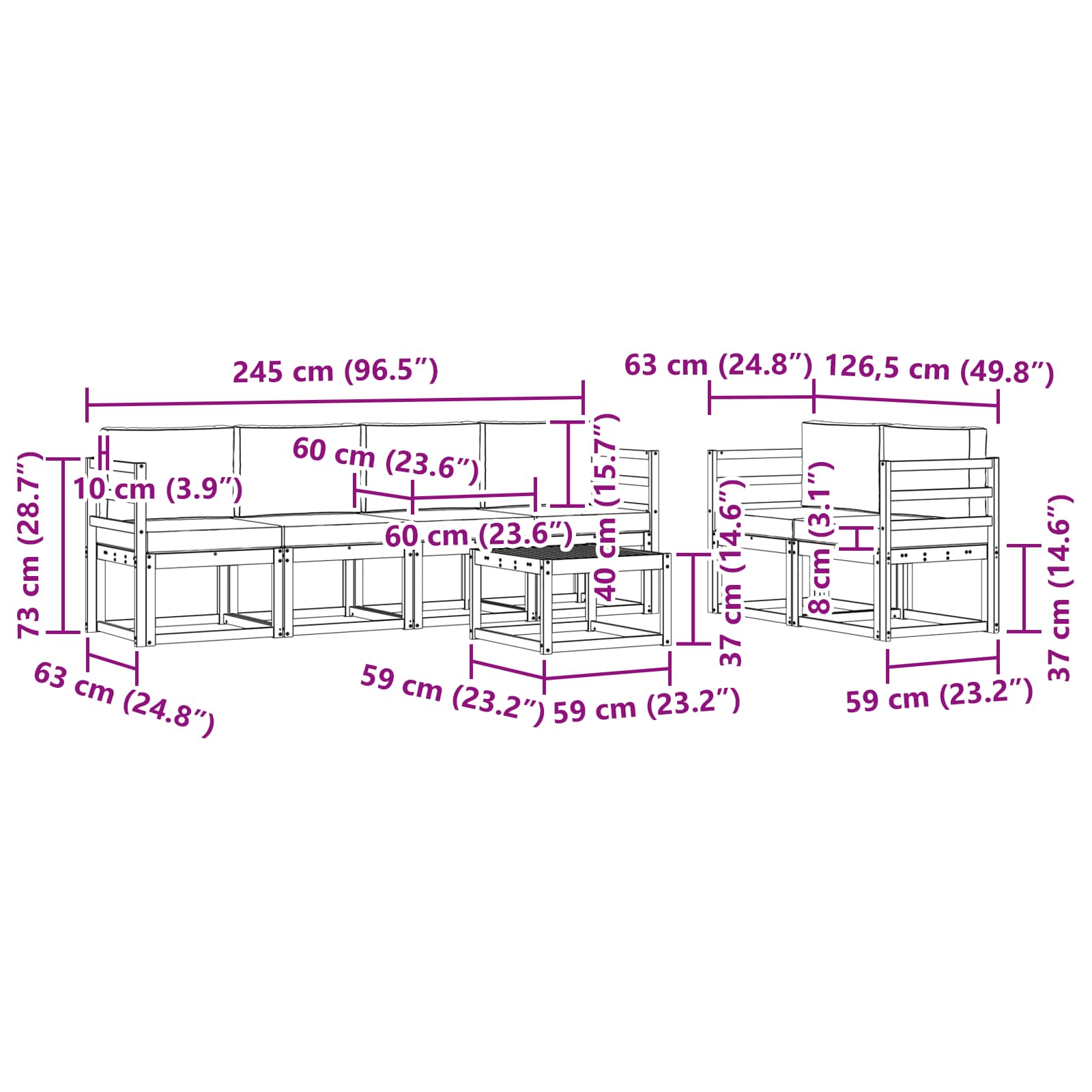 • 6 x Střední pohovka: 59 x 63 x 73 cm (D x Š x V)