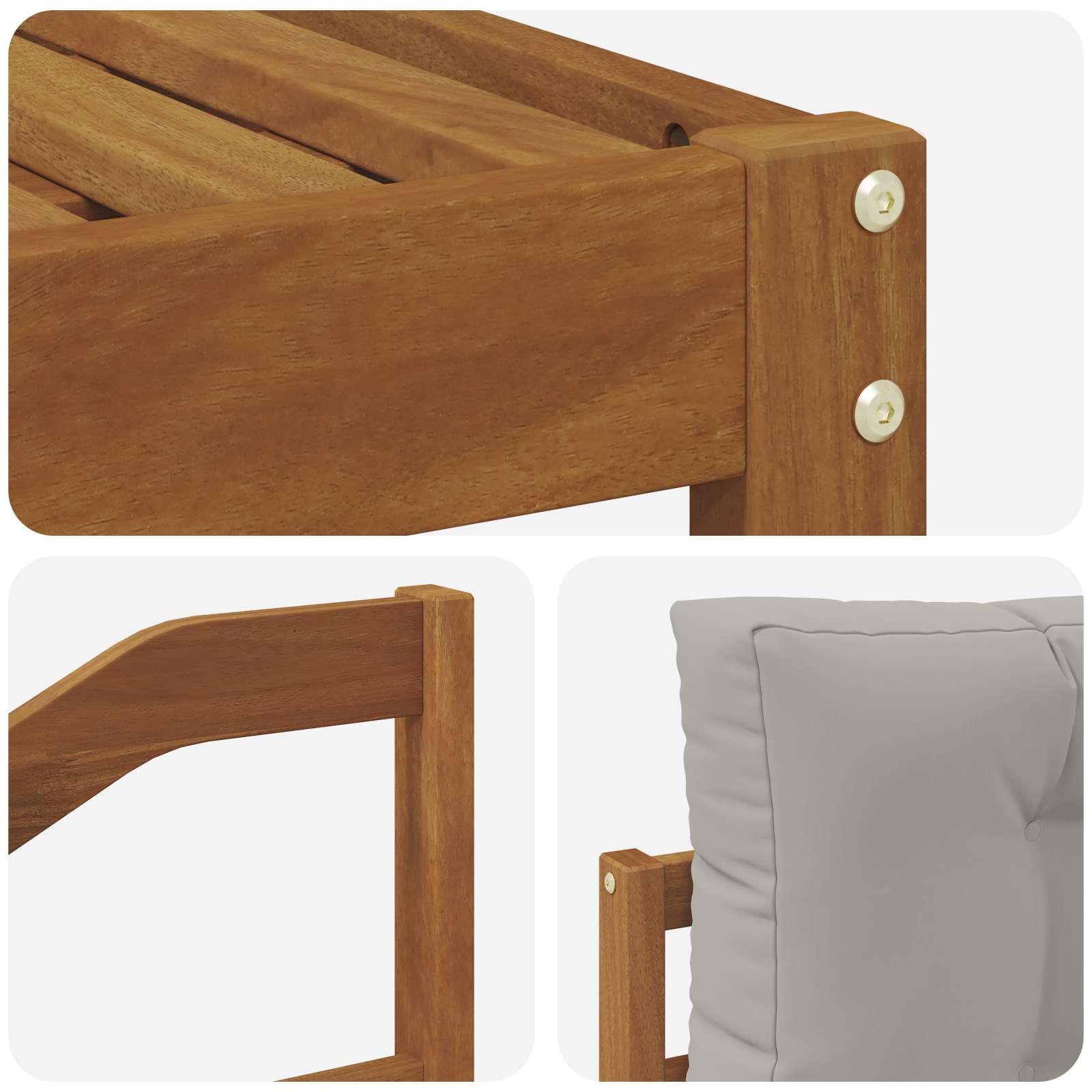 • Masivní akáciové dřevo: Tato venkovní sedací souprava je vyrobená z kvalitního akáciového dřeva, které je silné a odolné vůči povětrnostním vlivům. Jeho teplé, přírodní odstíny dřeva dodávají luxusní vzhled a skvěle se hodí do přírody.