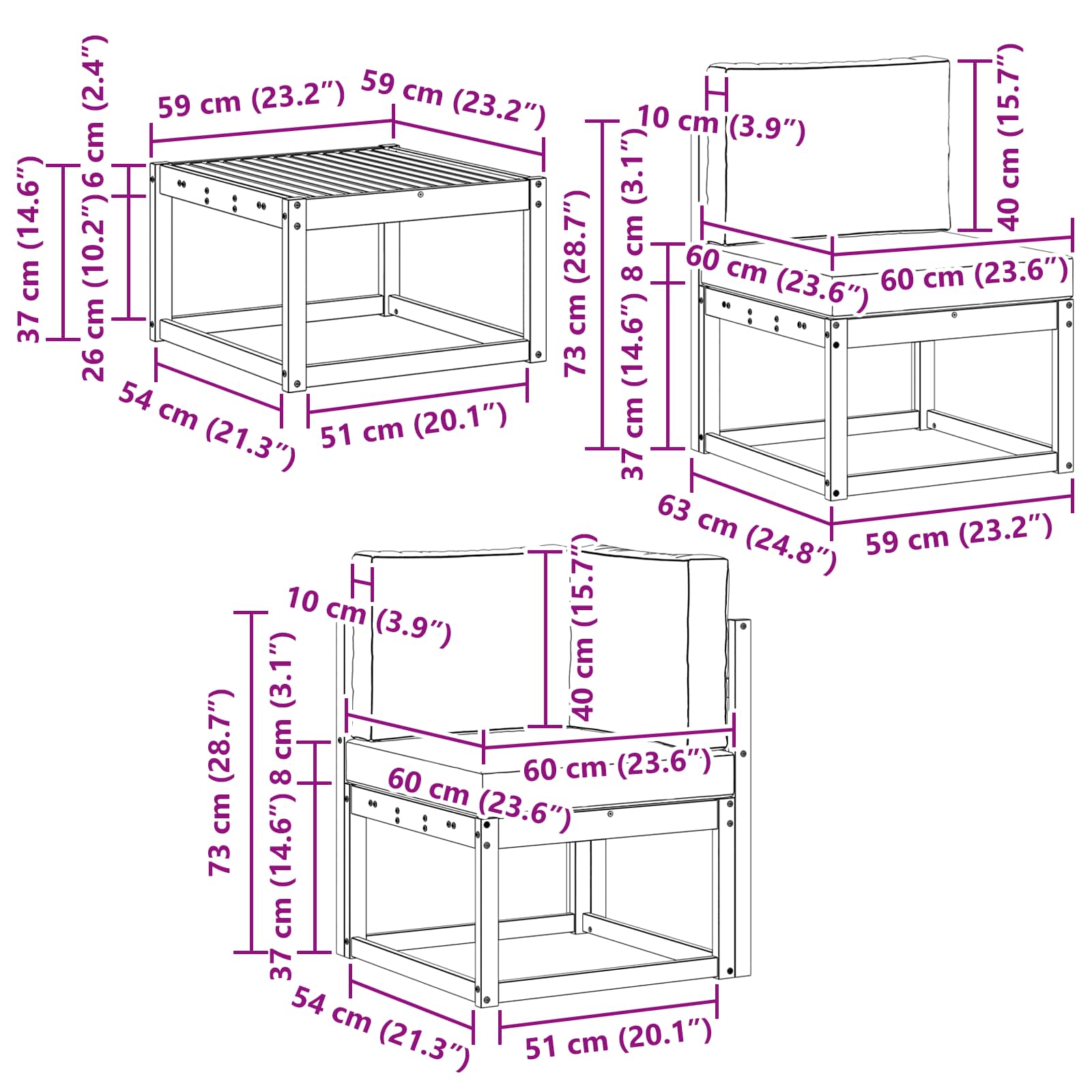 • 5 x Středová pohovka: 59 x 63 x 73 cm (D x Š x V)