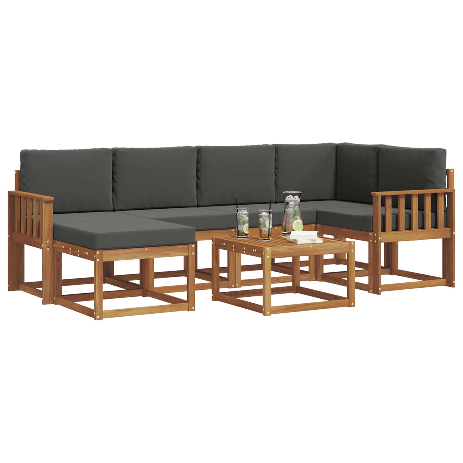 Sada venkovního nábytku spojuje styl a funkčnost a vytváří atraktivní středobod pro každou zahradu nebo terasu. Její moderní design má čisté linie a minimalistické detaily, které dodávají eleganci a podporují venkovní relaxaci a setkání s přáteli. Celá sada je z masivního akáciového dřeva, což zajišťuje trvanlivost a zajímavý vzhled, ideální pro ty, co hledají jak praktické, tak pěkně vypadající venkovní kousky.