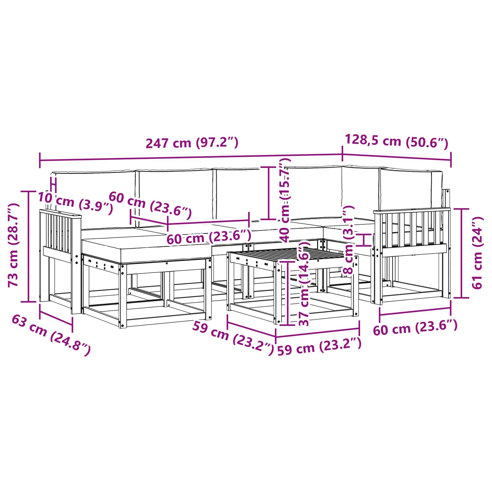 • 4 x Střední sedačka: 59 x 63 x 73 cm (D x Š x V)