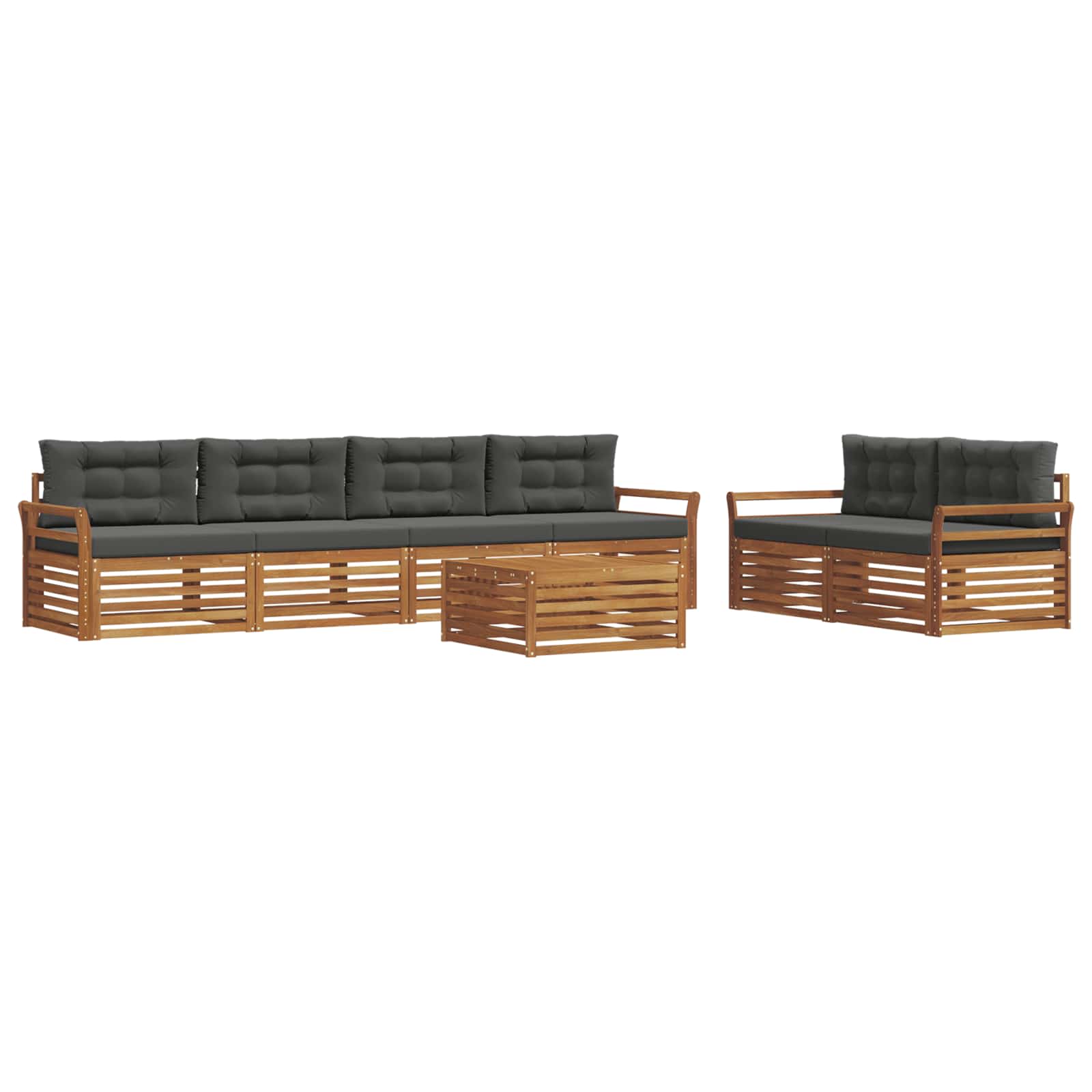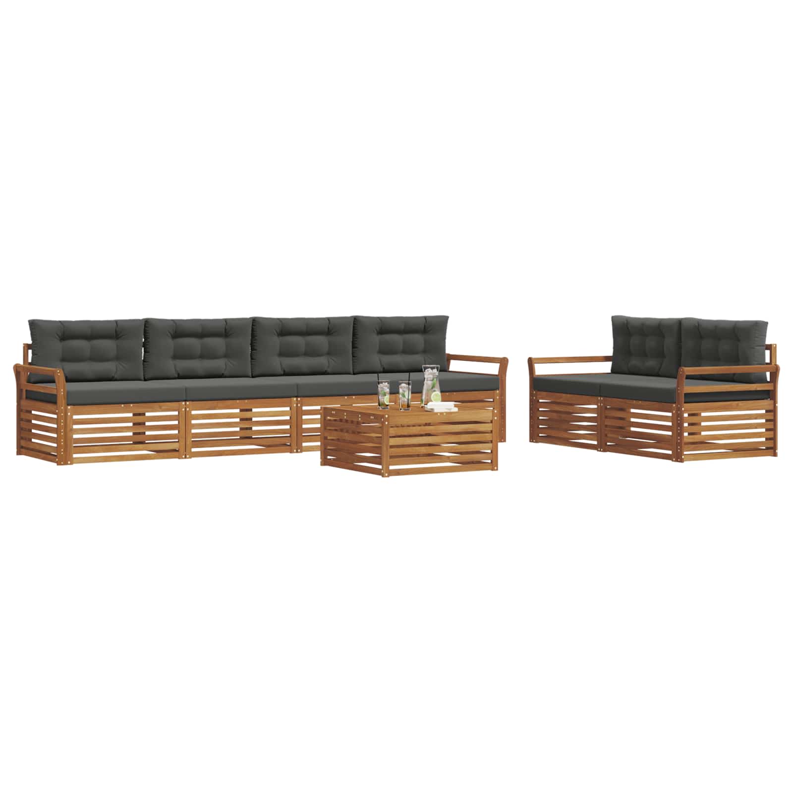 Tento venkovní nábytek spojuje styl a funkčnost, čímž se vytváří parádní centrum pro vaši zahradu nebo terasu. Moderní design s čistými liniemi dodává eleganci a vybízí k venkovnímu relaxu a setkání s přáteli. Odolné masivní akáciové dřevo zajišťuje dlouhou životnost a vizuální přitažlivost, ideální pro ty, co hledají praktičnost a šmrnc v venkovním zařízení.