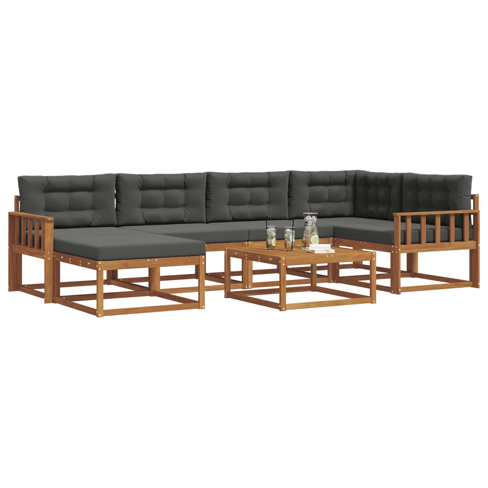 • Součásti: Sada obsahuje robustní rám, který poskytuje dobré sezení. Lamelový opěrák a područky z akáciového dřeva se skvěle hodí k celkovému designu a zvyšují pohodlí. Každý kousek je funkční podporou při dlouhém odpočinku na zahradě nebo u bazénu.