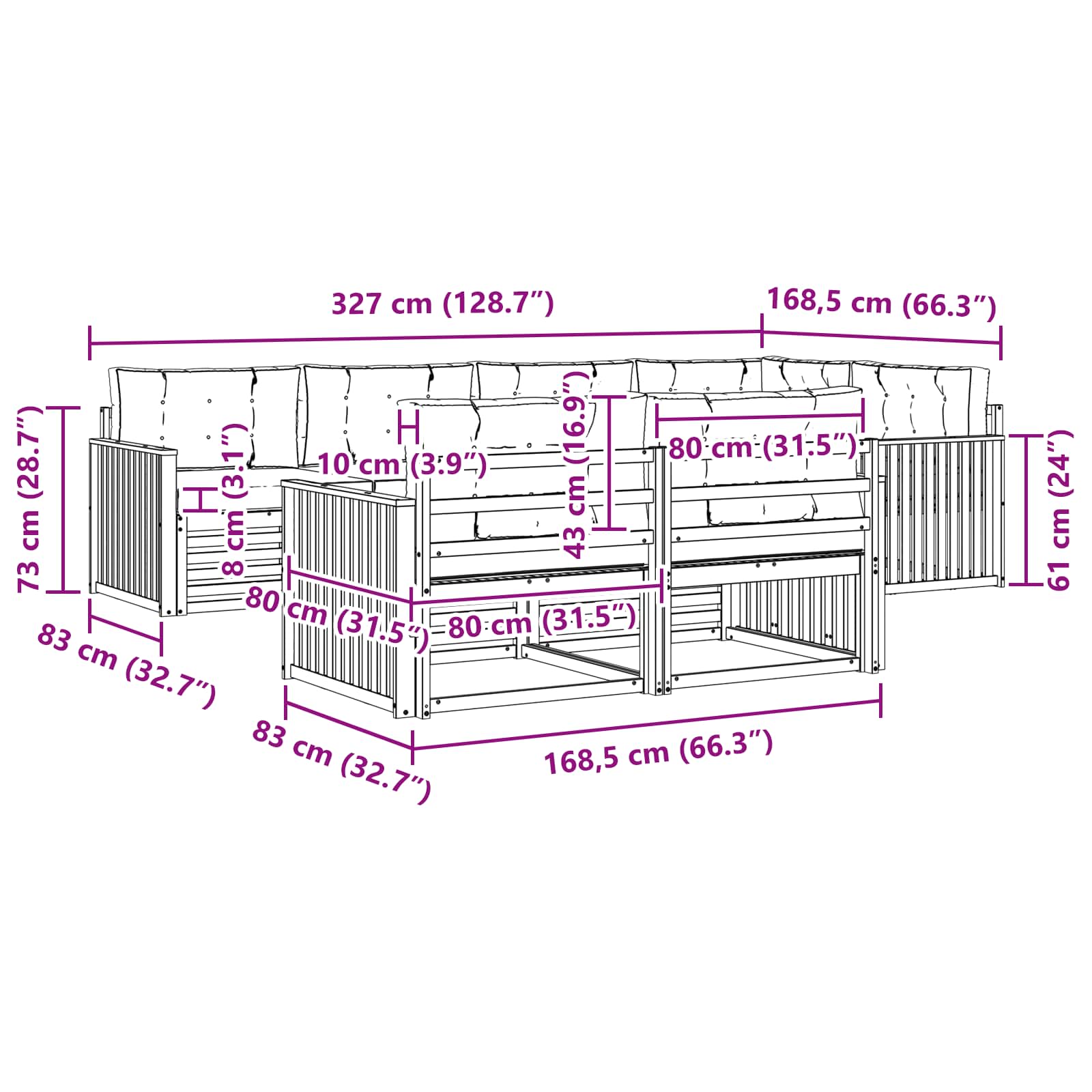 • 7 x Poduška na sezení: 80 x 80 x 8 cm (D x Š x V)