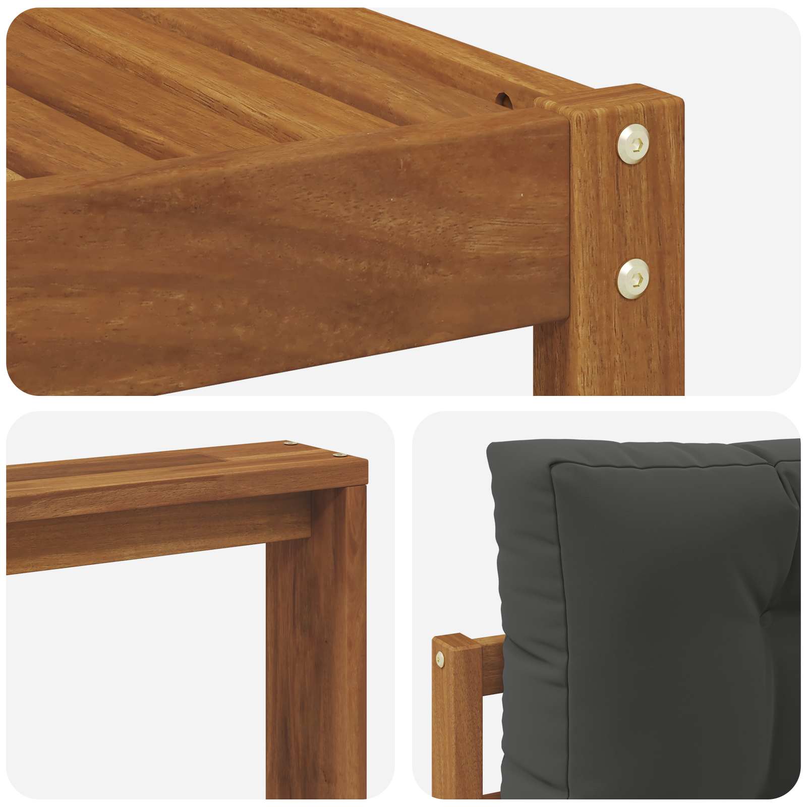 • Součásti: Sada obsahuje robustní rám, který poskytuje dobré sezení. Lamelový opěrák a područky z akáciového dřeva se skvěle hodí k celkovému designu a zvyšují pohodlí. Každý kousek je funkční podporou při dlouhém odpočinku na zahradě nebo u bazénu.