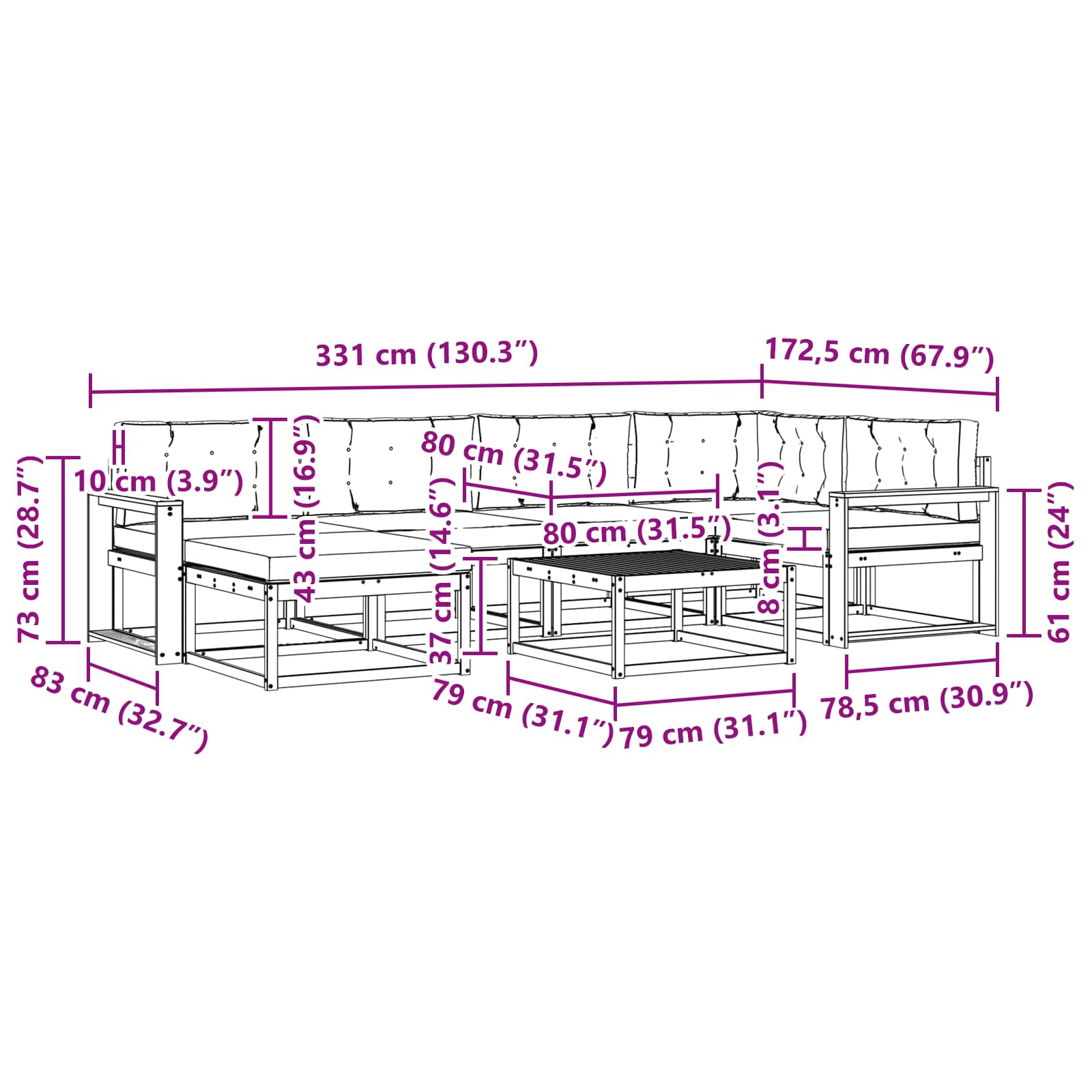 • 4 x Střední pohovka: 79 x 83 x 73 cm (D x Š x V)