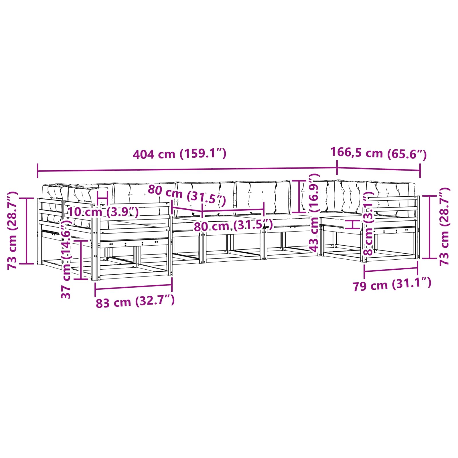 • 5 x Střední pohovka: 79 x 83 x 73 cm (D x Š x V)