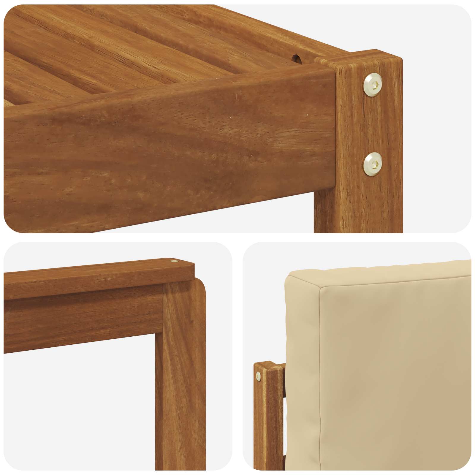 • Odolné masivní akáciové dřevo: Tato sada venkovního nábytku z masivního akáciového dřeva je známá svou trvanlivostí a odolností proti povětrnostním podmínkám. Pevná konstrukce zajišťuje stabilitu a dlouhou životnost, zatímco teplý přírodní ton vylepšuje zahradu nebo terasu.