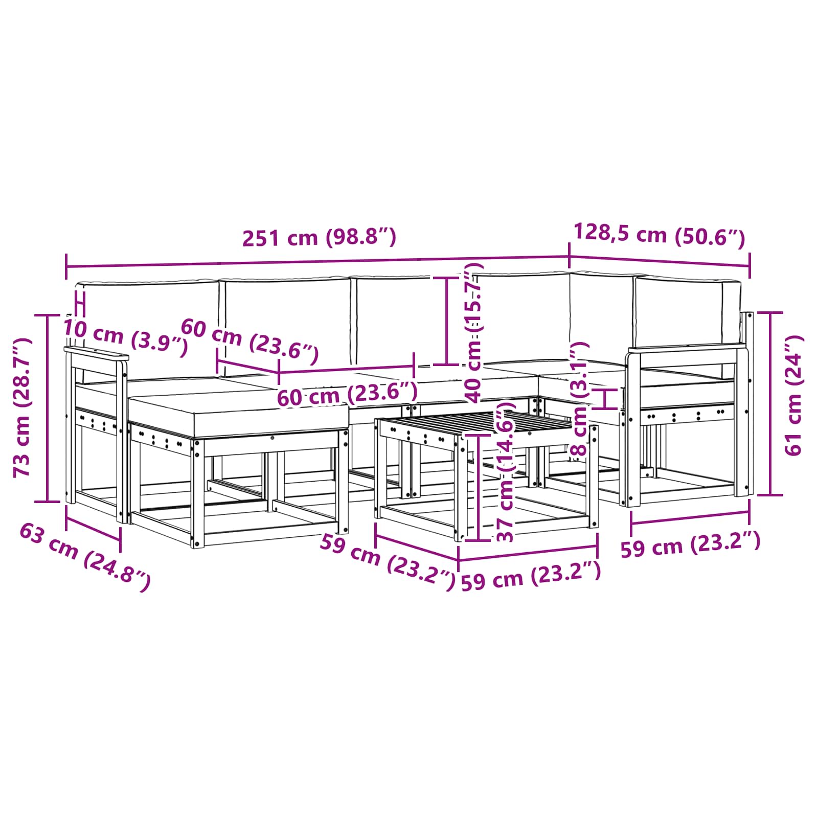 • 4 x Střední pohovka: 59 x 63 x 73 cm (D x Š x V)