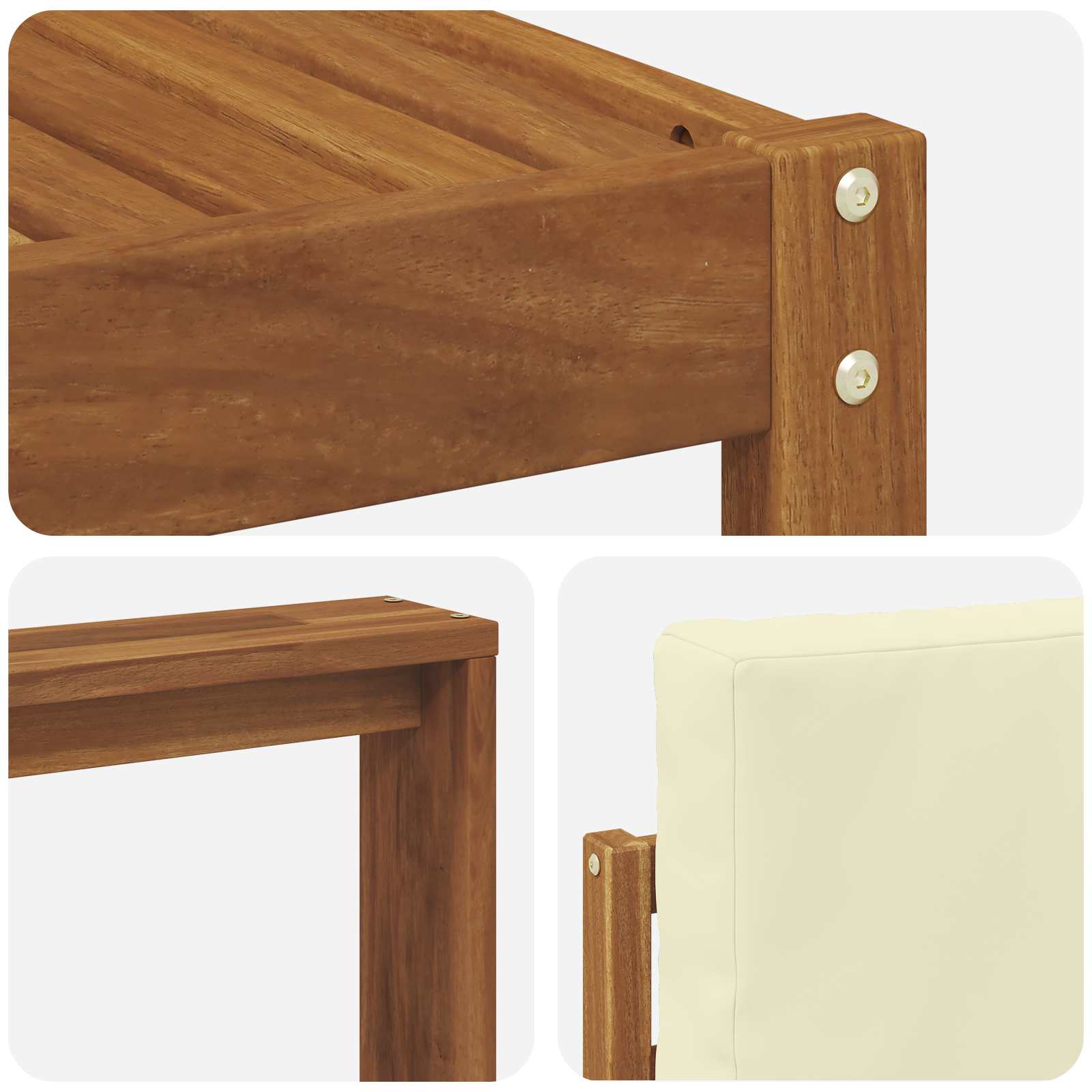 • Odolné masivní akáciové dřevo: Tato sada venkovního nábytku z masivního akáciového dřeva je známá svou trvanlivostí a odolností proti povětrnostním podmínkám. Pevná konstrukce zajišťuje stabilitu a dlouhou životnost, zatímco teplý přírodní ton vylepšuje zahradu nebo terasu.