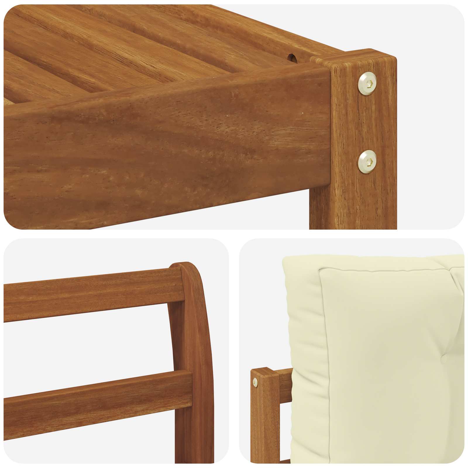 • Součásti: Sada obsahuje robustní rám, který poskytuje dobré sezení. Lamelový opěrák a područky z akáciového dřeva se skvěle hodí k celkovému designu a zvyšují pohodlí. Každý kousek je funkční podporou při dlouhém odpočinku na zahradě nebo u bazénu.