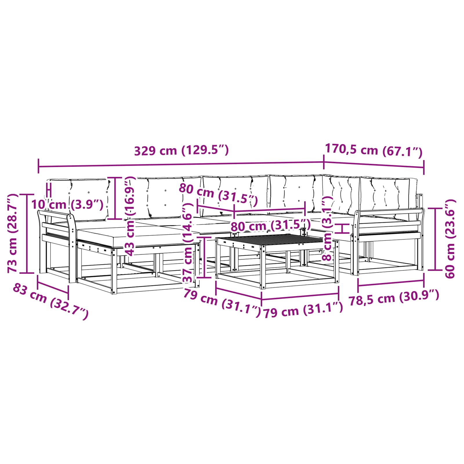 • 4 x Prostřední pohovka: 79 x 83 x 73 cm (D x Š x V)