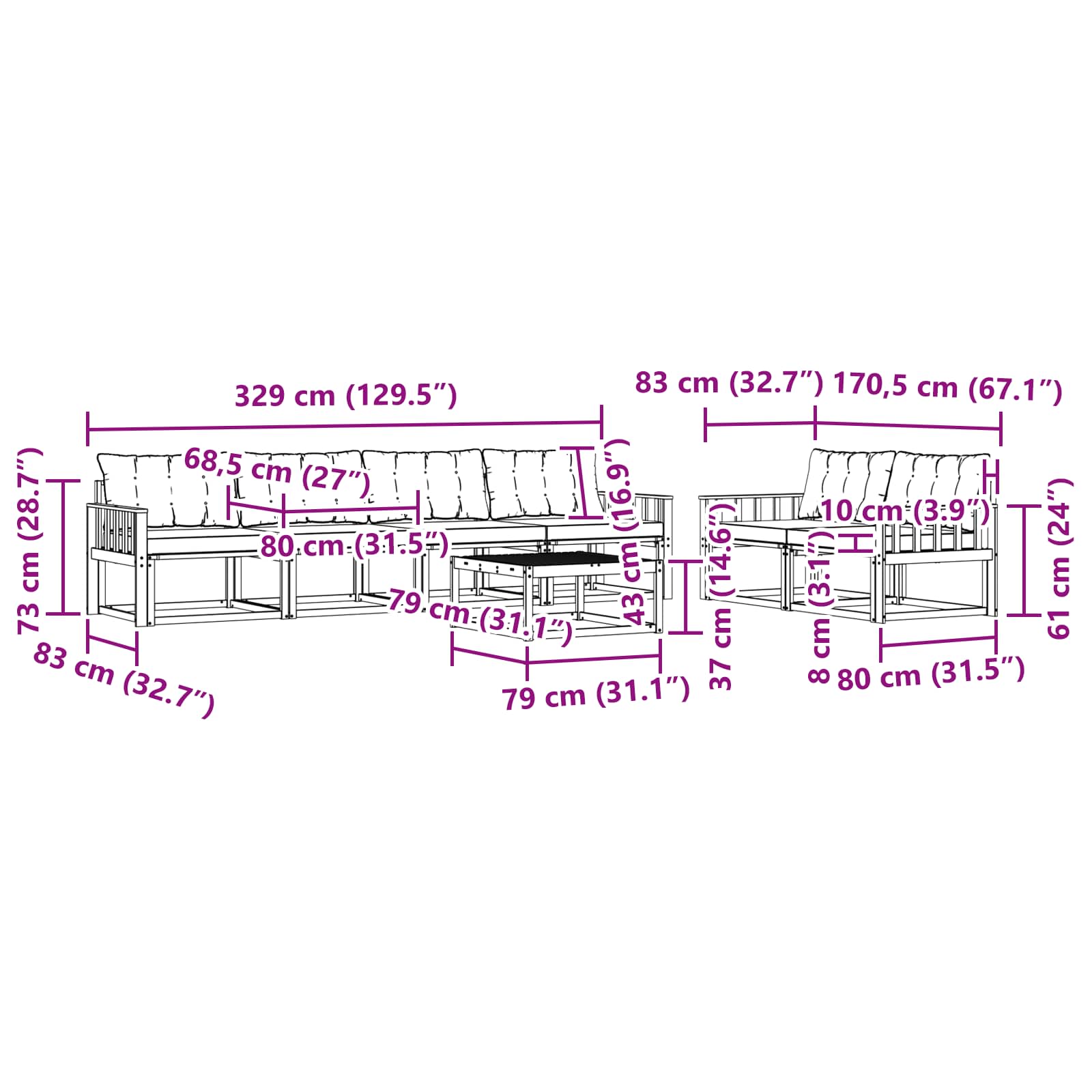 • 6 x Střední pohovka: 79 x 83 x 73 cm (DxŠxV)