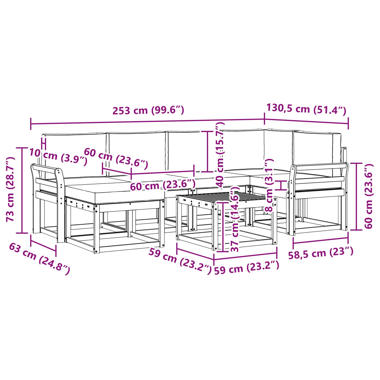 • 4 x Střední pohovka: 59 x 63 x 73 cm (D x Š x V)