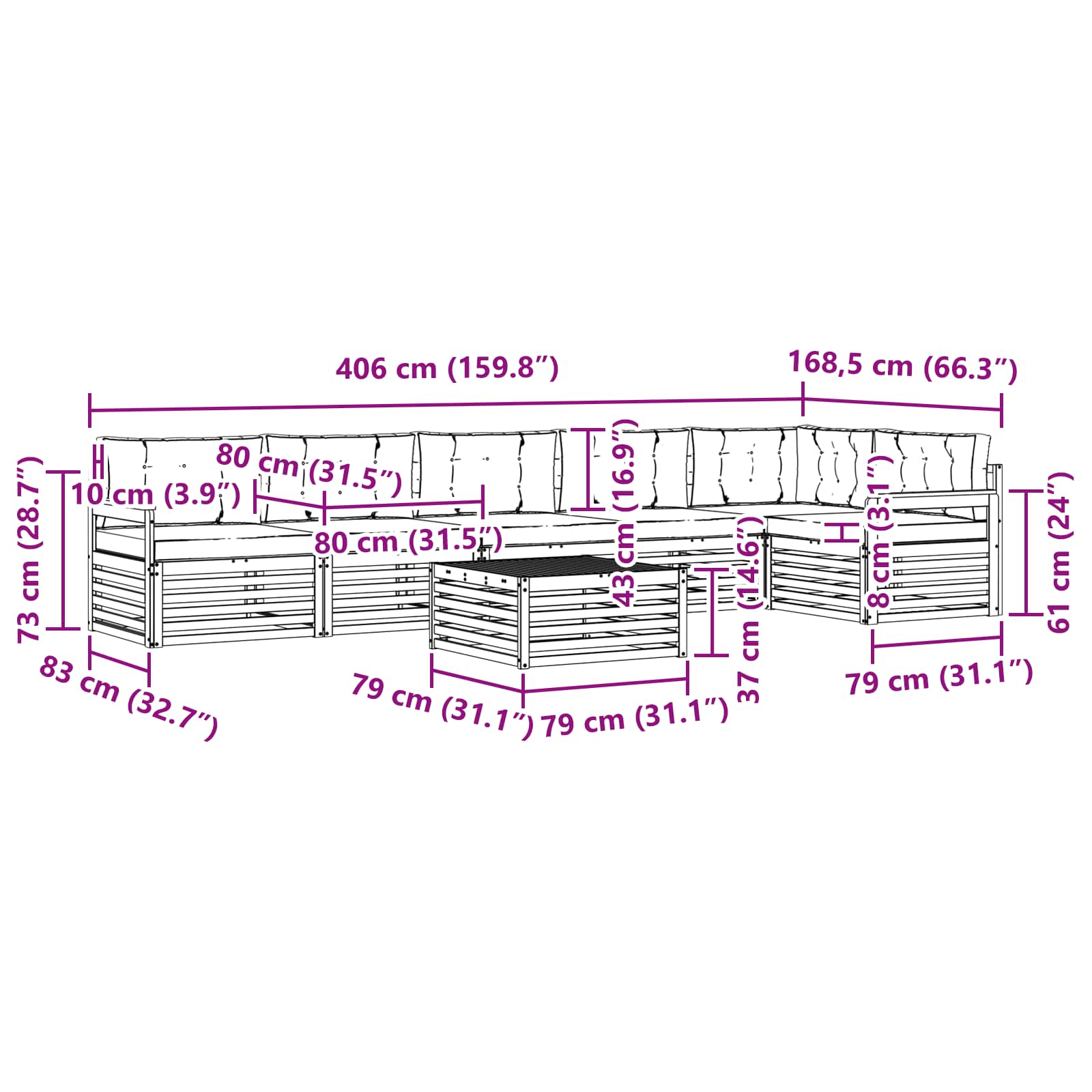 • 6 x sedací polštář: 80 x 80 x 8 cm (D x Š x V)