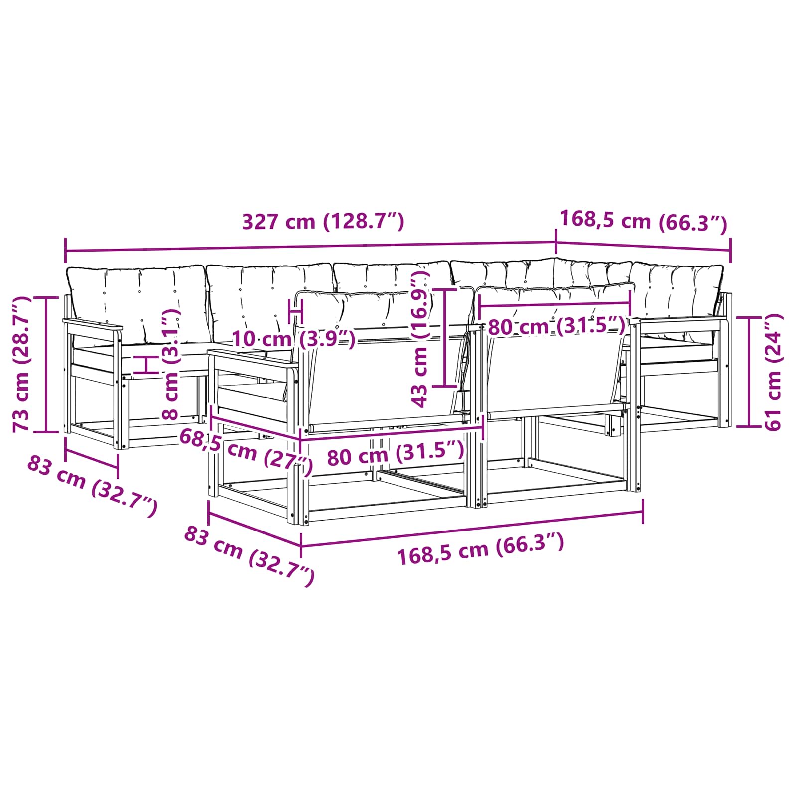 • 6 x středová pohovka: 79 x 83 x 73 cm (D x Š x V)
