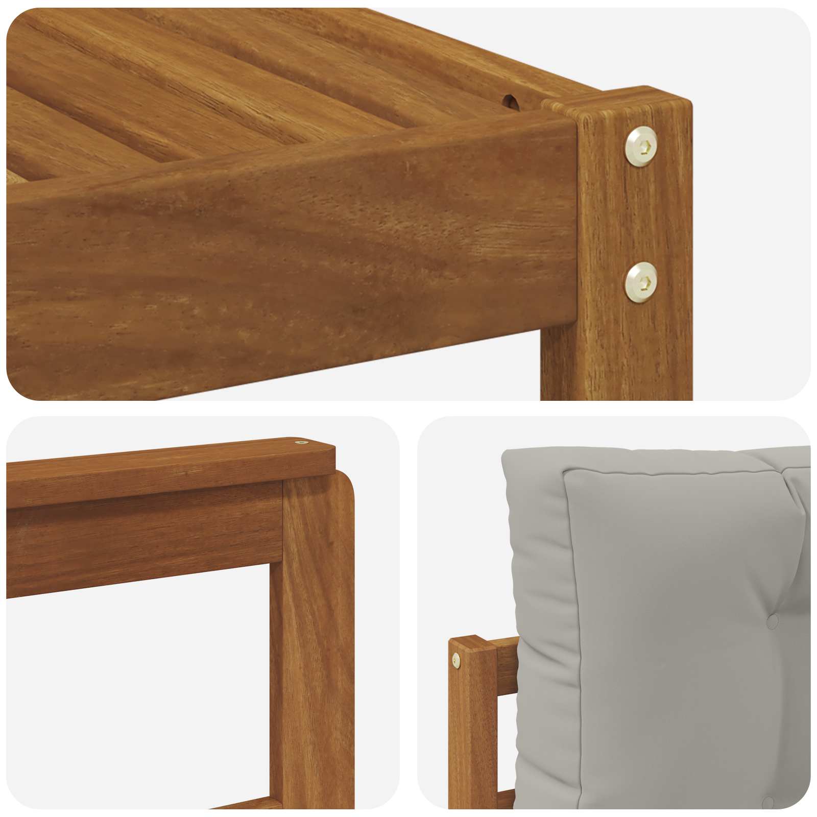 • Masivní akáciové dřevo: Tento pohovkový set je z kvalitního akáciového dřeva, co odolává povětrnostním podmínkám a hmyzu, takže vám bude dlouho sloužit. Má atraktivní strukturu a vypadá skvěle. Robustní konstrukce zajišťuje trvalou oporu a šmrnc.