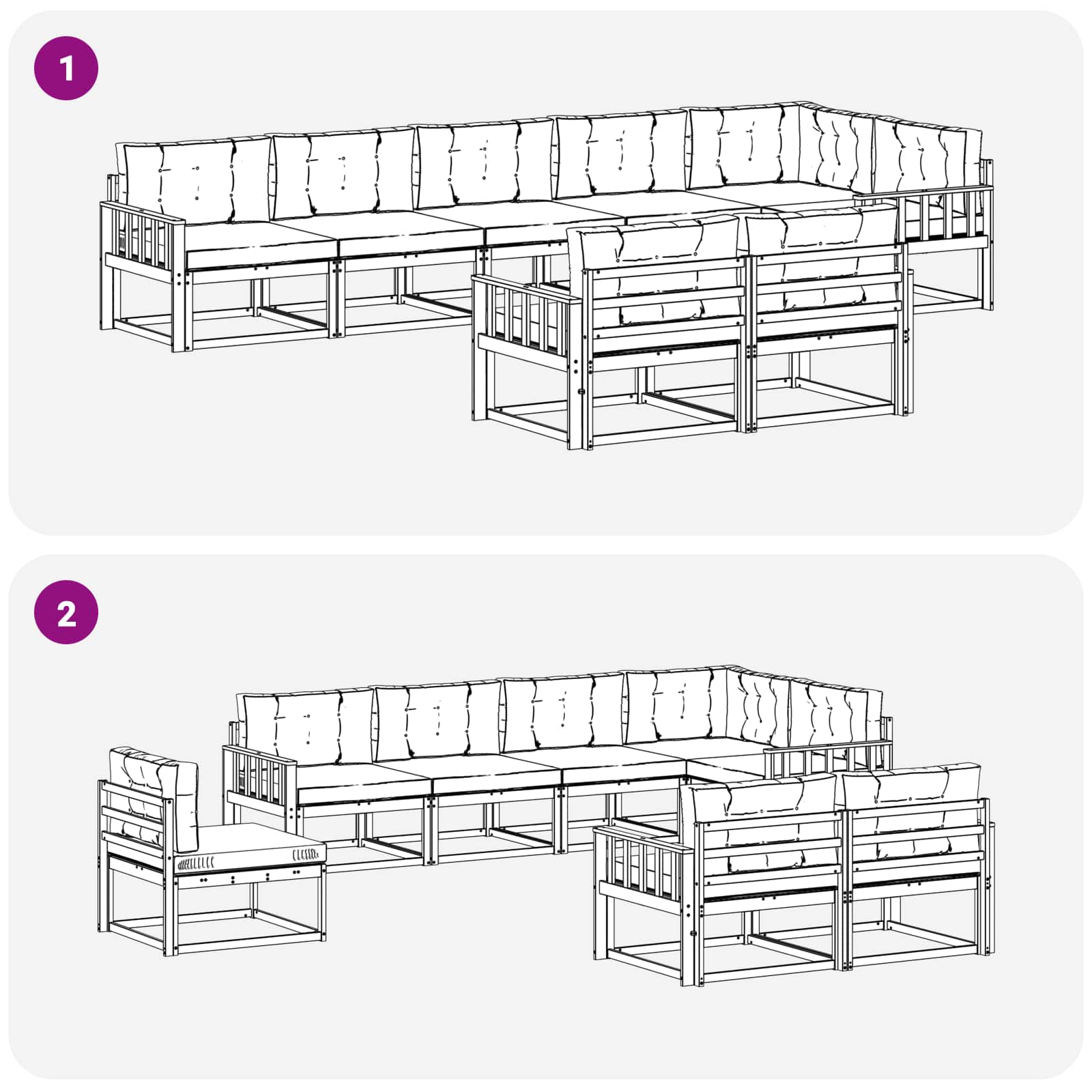 • Modulární flexibilita: Upravte rozložení soupravy na míru různým událostem nebo potřebám prostoru. Tato vlastnost je super pro počet hostů, které máte, a pro změny počasí. Umožňuje snadné přizpůsobení uspořádání.