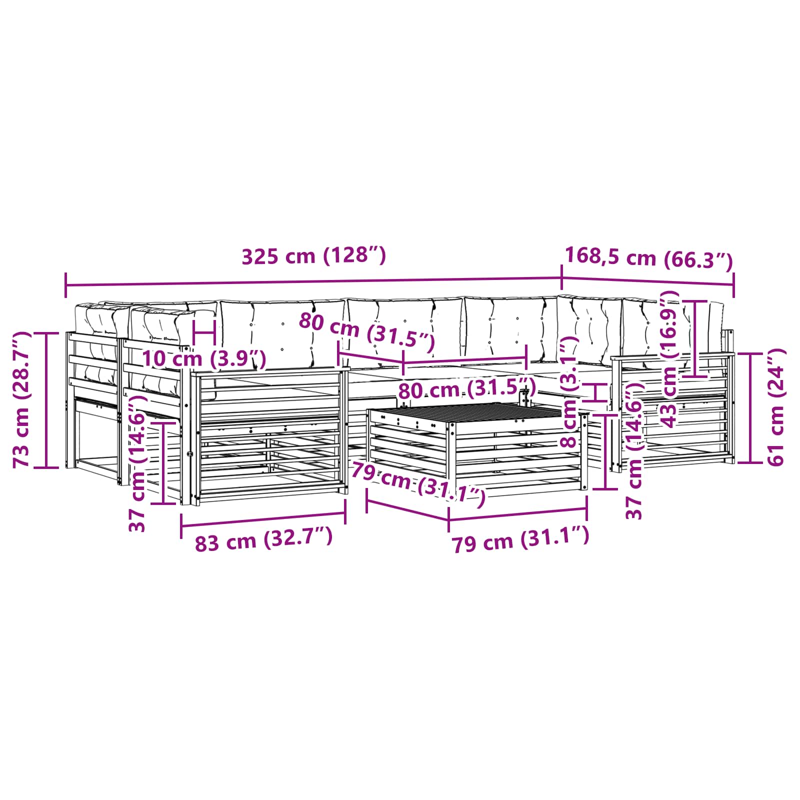 • 8 x Zádový polštář: 80 x 43 x 10 cm (D x Š x V)