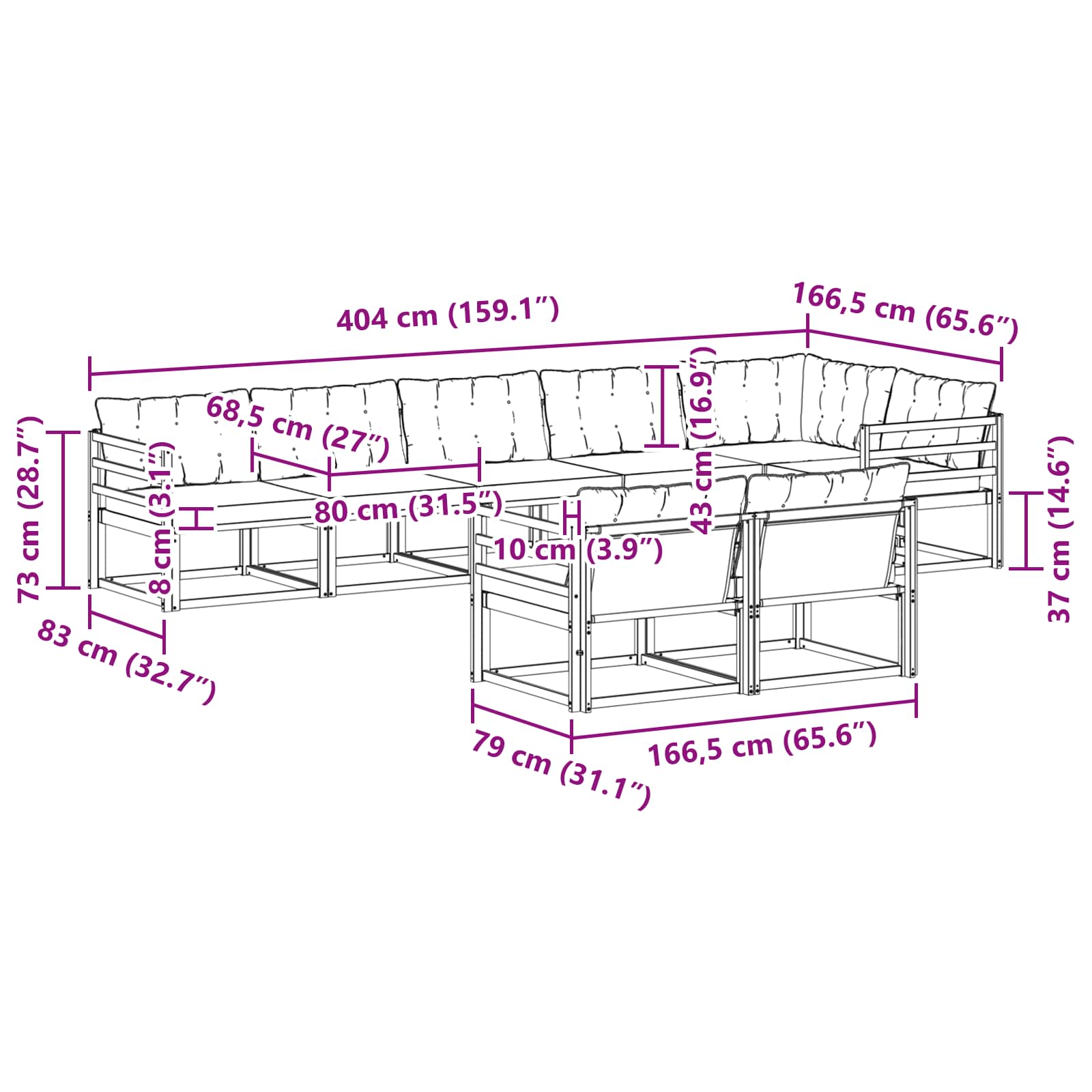• 7 x Střední pohovka: 79 x 83 x 73 cm (D x Š x V)
