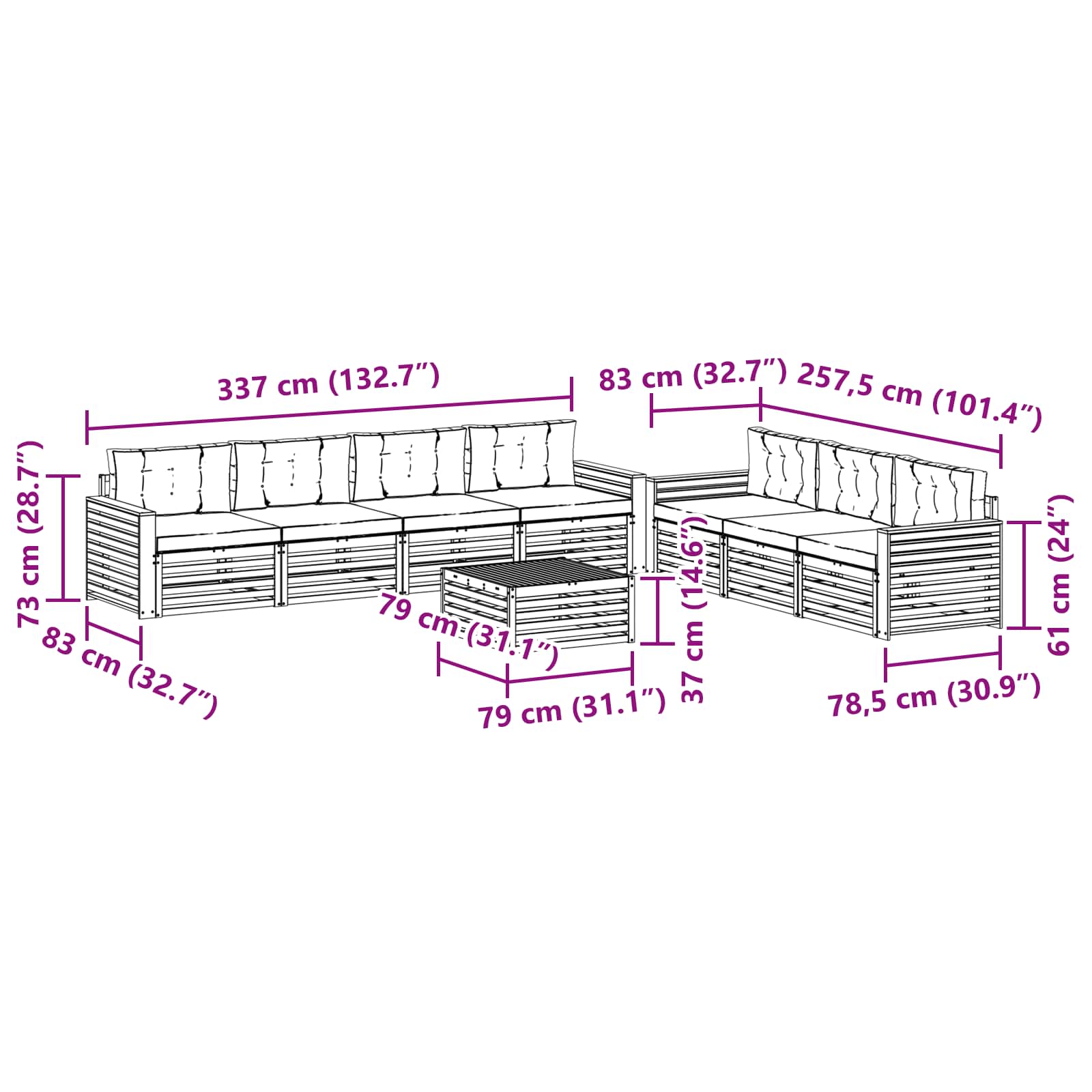 Sada venkovního nábytku spojuje styl s funkčností a stane se ústředním bodem vaší zahrady nebo terasy. Moderní design s čistými liniemi a minimálními detaily dodává eleganci a podporuje venkovní odpočinek i společenské aktivity. Celá sada je z masivního akáciového dřeva, což zaručuje odolnost a stálý vzhled, ideální pro ty, kteří chtějí kombinaci praktičnosti a designu.