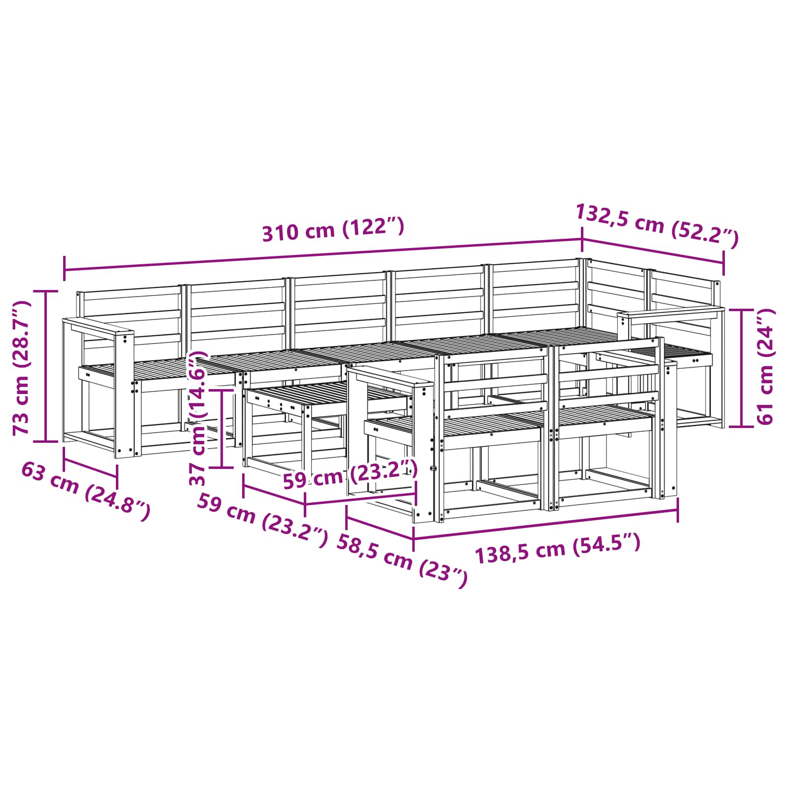 • 7 x Středová pohovka: 59 x 63 x 73 cm (D x Š x V)