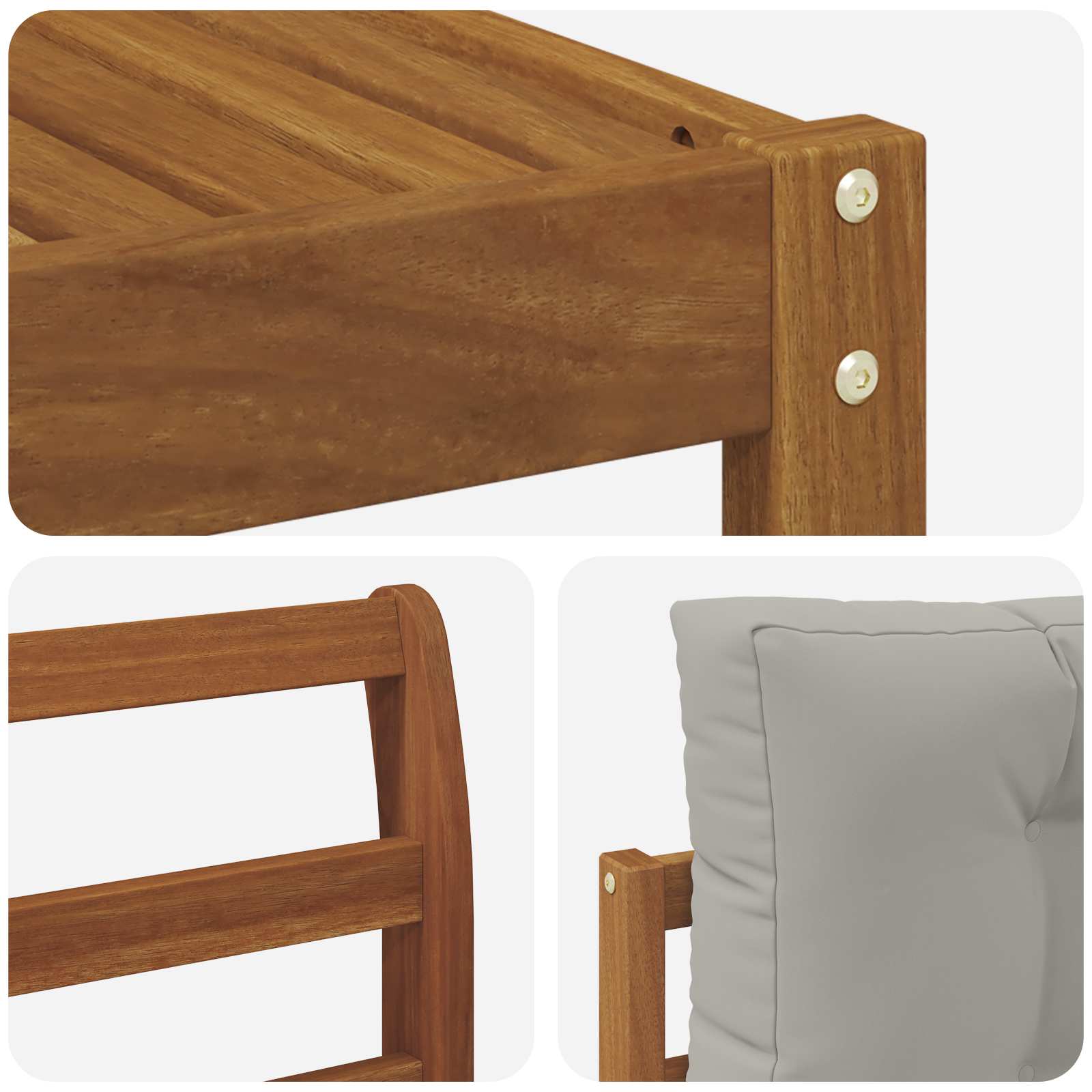 • Akáciové dřevo: Celý set je z masivního akáciového dřeva. Je odolné a krásné, zajišťuje dlouhou životnost a přirozený vzhled. Jeho úžasná struktura a odstín skvěle sednou do přírody a dodávají rustikální šarm.