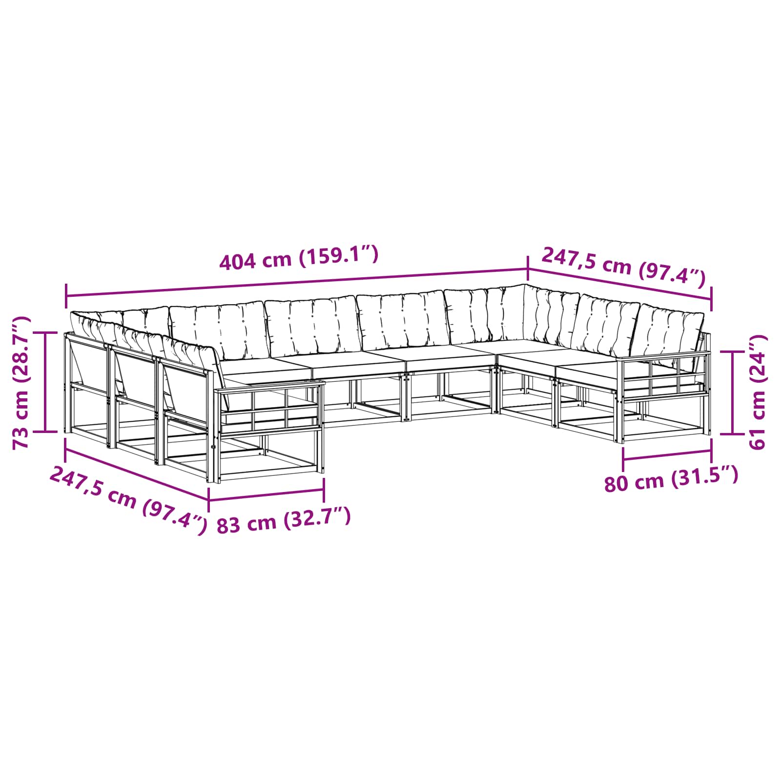 • 7 x Středová pohovka: 79 x 83 x 73 cm (D x Š x V)