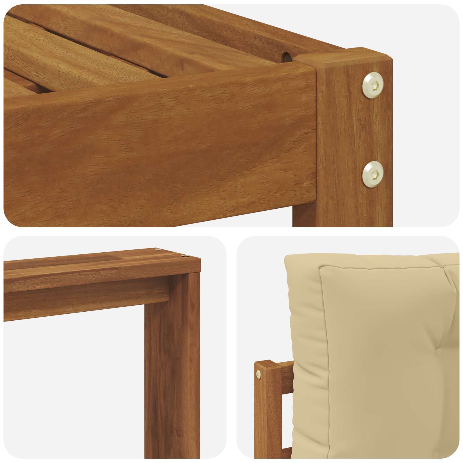 • Odolné akáciové dřevo: Vyrobeno z kvalitního masivního akáciového dřeva, tohle sofa je navrženo tak, aby vydrželo. Akácie je odolná vůči opotřebení, takže je ideální pro venkovní nábytek. Jeho robustní konstrukce zaručuje stabilitu a přitom si zachovává stylový vzhled.