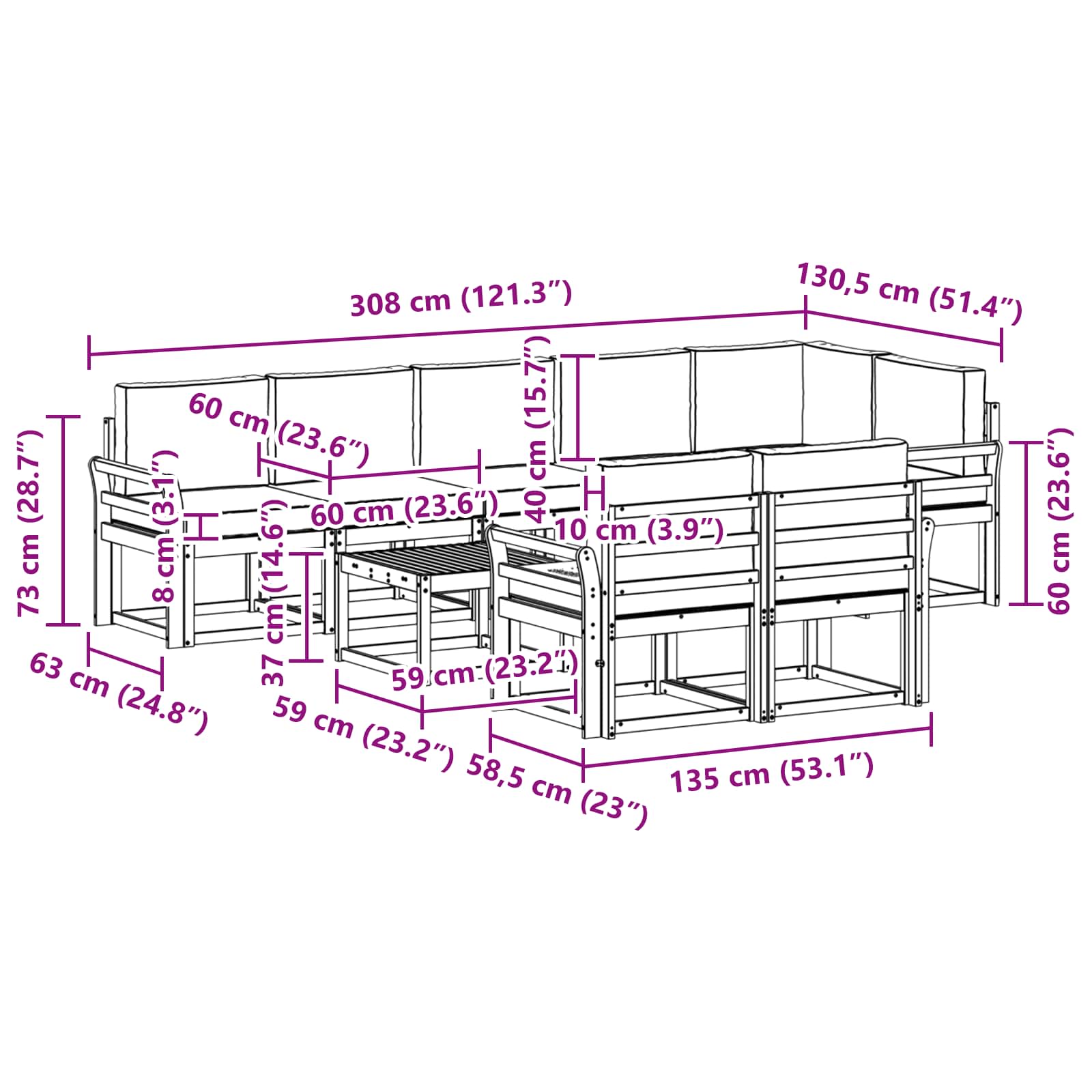 • 7 x Středová pohovka: 59 x 63 x 73 cm (D x Š x V)