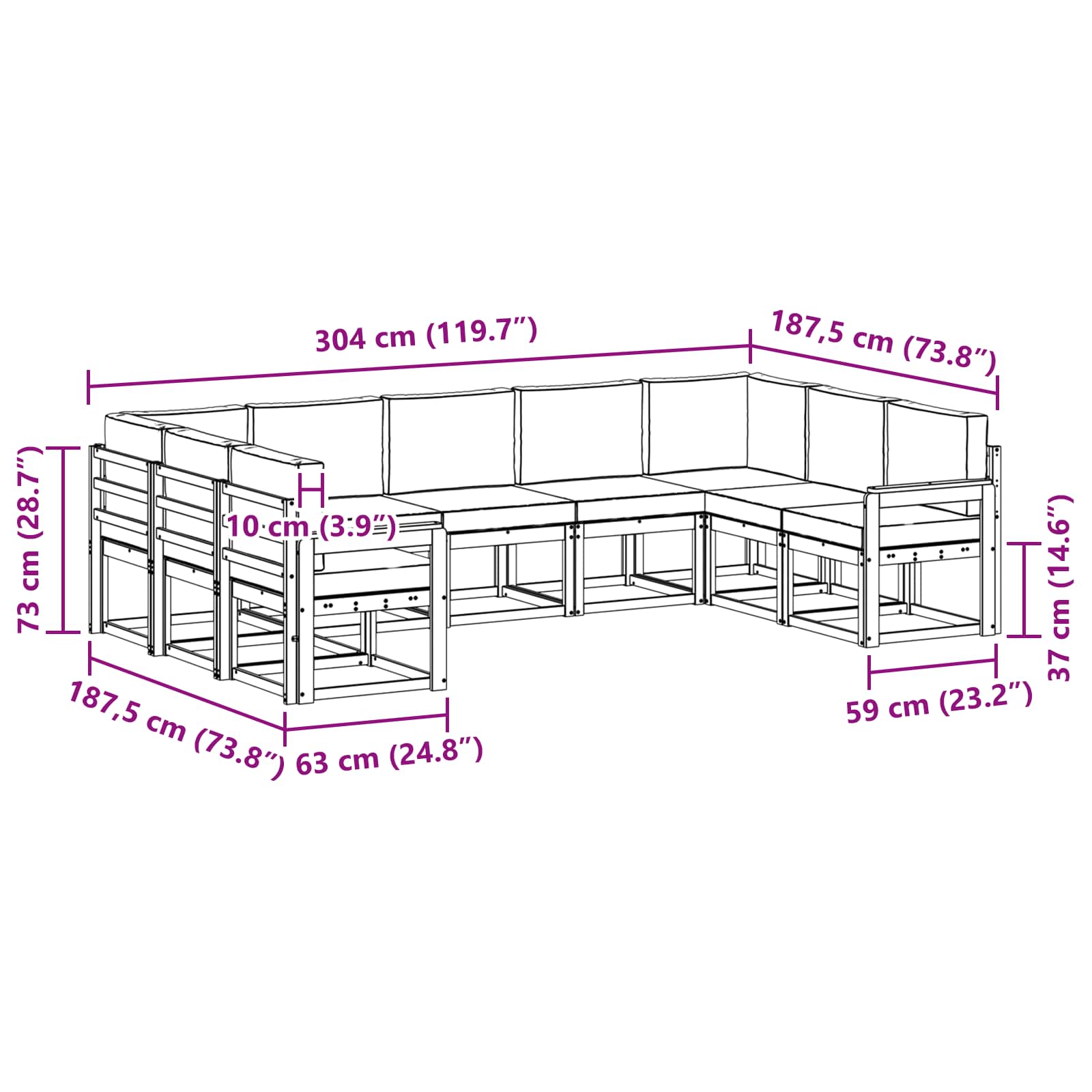 • 7 x Středová pohovka: 59 x 63 x 73 cm (D x Š x V)
